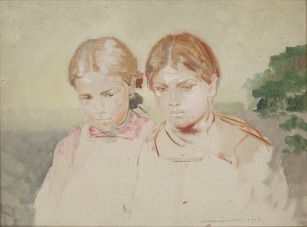 Curator: What strikes me first about this painting is the raw application of the oil paint. Editor: Yes, it has an immediate presence, doesn't it? These two children have a weight to their gaze despite the somewhat hurried brushstrokes. This is Tadeusz Makowski’s "Brothers", created in 1920. Curator: Makowski’s artistic journey, particularly his turn towards children as subjects after relocating to France, is fascinating. Considering the oil paint he uses and the way he seemingly carves out the figures through layered brushwork, I find myself thinking about the material choices that frame our perception of childhood during that era. The children almost appear to emerge from the background. Editor: Absolutely. He spent a considerable time of his artistic life depicting childhood—orphans especially. We should examine it through the context of interwar Europe. Notice how this style embraces simplicity? It counters prevailing academic portraiture, thus speaking volumes about how social representation and art world trends were changing. It reflects the democratized representation afforded by modernism. Curator: And if you look closely, it seems he used the butt end of his brush to incise lines, almost etching the facial features. This, for me, really emphasizes his intimate connection to the art-making process. What’s interesting too, I think, is considering the market for these types of portraits at the time – who was buying and commissioning this kind of work? Was this aesthetic driven by his clientele, or by artistic conviction? Editor: Those are compelling questions. What I notice is that, as modern art started entering public collections, the artists began to address universal themes which had before them been seen as either niche or radical. You get that here. "Brothers" speaks to fundamental aspects of human relations at the time as Europe reshaped itself following the end of war. Curator: Precisely, you make a valid point! It challenges this notion of what portraits can achieve. We are moved far beyond status or even individual identity. Editor: Indeed. Makowski provides a unique perspective on how this pivotal moment in European history impacted how we perceive identity on canvas. Curator: To put a cap on it: his distinctive handling of the materials makes you pause and consider both the social moment as well as art-making techniques. Editor: And ultimately encourages us to consider children, brotherhood, and Europe through new lenses.