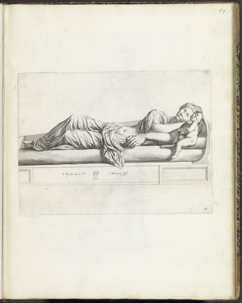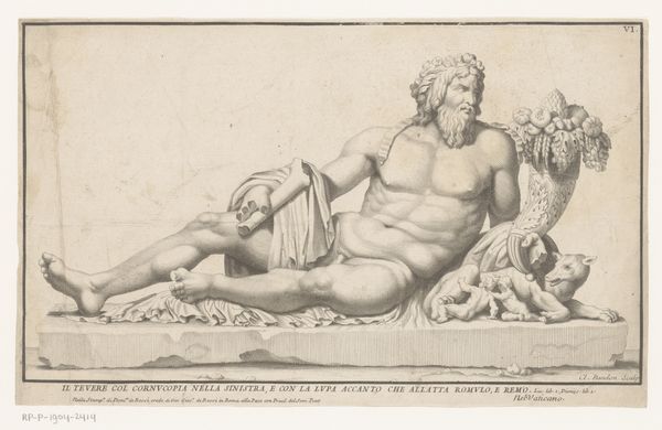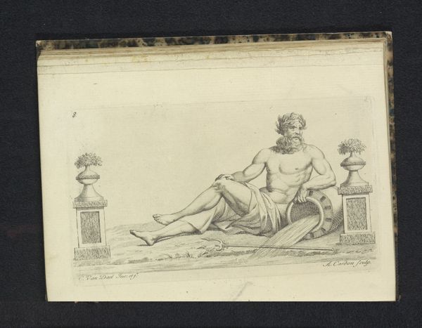 Curator: Here we have “Riviergod,” an engraving made between 1772 and 1773 by Antoine Alexandre Joseph Cardon, currently held in the collection of the Rijksmuseum. Editor: He looks so relaxed, almost languid. It's like he's on a Roman holiday, or maybe just perpetually hungover from nectar of the gods. Curator: Well, River Gods, historically, represent the power and bounty of their respective waterways. This particular depiction utilizes the visual language of Neoclassicism—simplicity of form, clear lines—all to communicate ideas of order and control, in keeping with Enlightenment ideals. Editor: Order and control? With him reclining like that, pouring out water... It reads more like an advertisement for slowing down and enjoying life, even if it is a bit on the nose with the spilling water motif of abundance. Curator: The spilling water isn't just an abstract concept, it connects the figure to his domain: a continuous flow of sustenance and commerce. River Gods were foundational figures in mythology across cultures. Their visual representation provides insight into how these societies conceived of the natural world and their relationship to it. Editor: I suppose. I see more than just the literal river, you know? I see this archetype— the powerful, grounded, masculine presence inseparable from its life source. Makes me consider the stories we tell ourselves about who has the power and access and why. Curator: Indeed, allegorical works can reveal power structures, artistic aspirations, and cultural beliefs... All these layered interpretations provide us a view into history through art. Editor: I like that it leaves space for modern-day musings. Who holds the "water" in society now, literally and figuratively? Curator: A provocative question, and an enduring one that the symbolism prompts. Editor: Absolutely. It's more than just an old drawing of a slightly too-chill deity; it’s a current still running through our world.