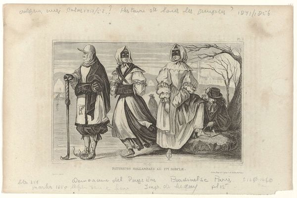 Curator: Here we have a drawing from 1857, whose title translates to "Koopman, warrior, Clovis I and Clothilde in clothing from the third and fifth century." Editor: Wow, that's quite a mouthful. My first impression is that it looks incredibly studied and a little stiff. It almost feels like a playbill from some serious historical drama. Curator: Indeed. Its neoclassical style presents figures rigidly posed, each figure rendered in meticulous detail using ink on paper. The drawing belongs to a tradition of academic art. Editor: The figures, each labelled beneath, stand in chronological order and are presented almost like costume studies, separated by faint vertical lines, almost as if presented for our approval. There's a sense of reverence for the past that borders on fetishistic. Curator: The artist meticulously researches and represents clothing styles across two centuries, underscoring a commitment to historical accuracy within the aesthetic constraints of Neoclassicism. The linear precision creates distinct forms but may detract from emotional expression. Editor: But maybe the stiffness adds something. Clovis looks imposing, while Clothilde, in contrast, looks much softer. It is curious how she appears with more adornments than Clovis! It speaks, perhaps, to the differing ways they exercised power in their day. Curator: An intriguing interpretation, especially if we consider her influence on Clovis’s conversion to Christianity. The artist juxtaposes historical representation with an emphasis on surface textures through delicate hatching techniques, enhancing the materiality of the garments. Editor: Overall, I'm left with the impression that the artist wanted to document the past precisely and did not set out to inspire. It's a fascinating exercise in rendering the past visible. Curator: Agreed. It reveals as much about 19th-century historical interpretation as it does about the clothing of figures from the early centuries of European history.
