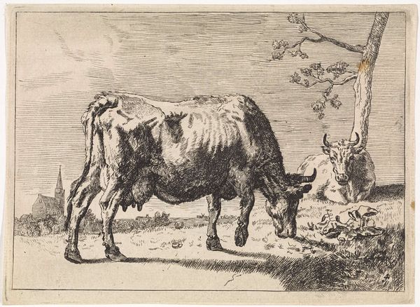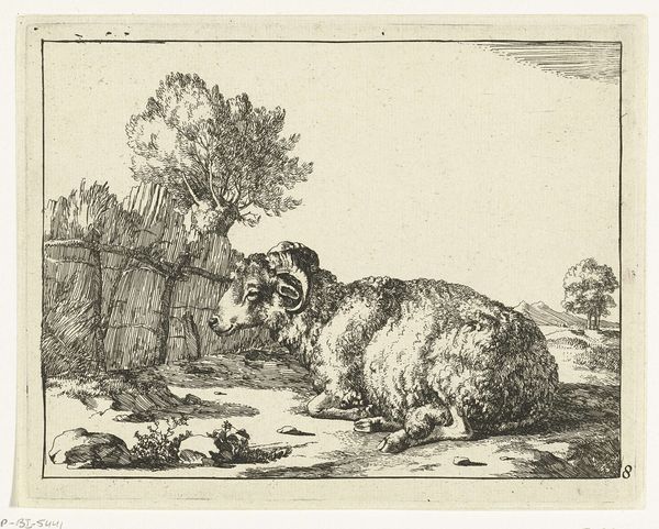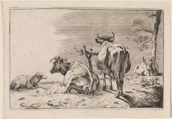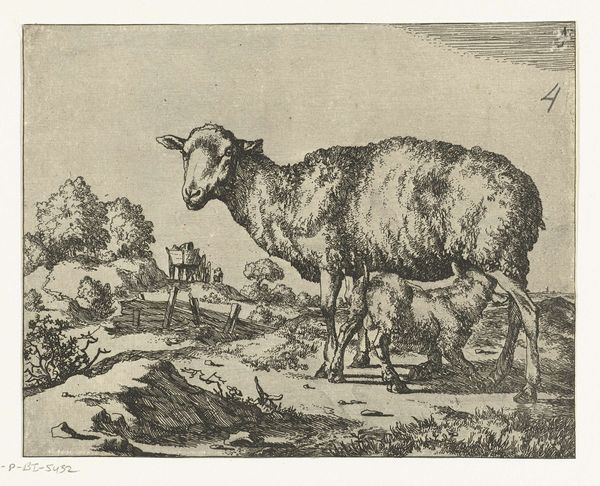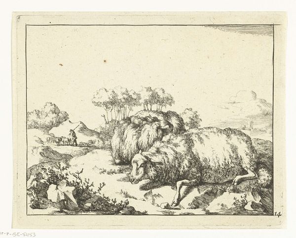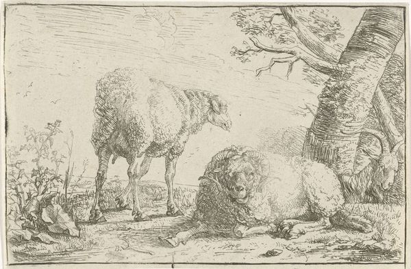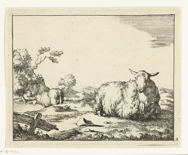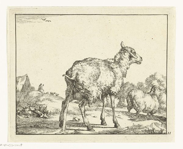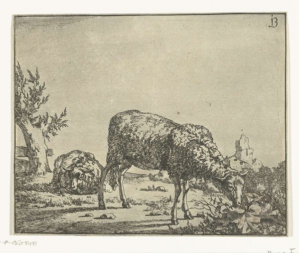 Marcus de Bye created this etching, "Standing and Lying Sheep with Farm in the Background," in the 17th century. The composition, dominated by two sheep, presents a formal study in contrasts. The sheep in the foreground is in repose, its form a horizontal mass. The sheep is rendered with dense, textural lines that define its wool, inviting a tactile imagination. In contrast, a standing sheep disrupts the calm, its vertical stance creating a visual tension. Behind, the farm introduces another layer of structural complexity. The artist uses linear perspective sparingly, yet effectively, to suggest depth. De Bye's etching doesn't just depict animals; it explores the formal relationships between line, texture, and space. These choices invite us to consider how the artist uses form to create meaning. Art’s essence lies not only in what is represented but in how the representation is constructed.