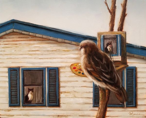 Editor: We’re looking at "Songbird II," by Lucia Heffernan, likely an oil painting, although the date of its creation seems unknown. The image depicts a bird perched on a branch, wearing headphones, and I can't help but be amused by the image. It strikes me as quite whimsical, and perhaps even slightly poignant. What do you make of this piece? Curator: Oh, I adore Heffernan's ability to imbue animals with such relatable human qualities! For me, this bird, so engrossed in its private sonic world, embodies the very essence of our modern, tech-saturated lives. Doesn’t it feel like you are sometimes that bird, oblivious in your own curated playlist while the world just sort of... chirps around you? And I can almost hear the music, can’t you? What do you imagine this bird is listening to? Editor: I imagine it is something classical...perhaps it is a Bach cantata. It definitely amplifies this air of solitary contemplation. It also brings up the idea of imposed silence - the world wanting the bird's sounds silenced, forcing the bird to seek its own musicality. Curator: Oh, that’s a thought-provoking reading of it! The "imposed silence" is very present, and gives the image more layers to consider. Perhaps this songbird is finding solace, or even rebellion, in its private concert? Editor: Definitely rebellion in enjoying something, but it makes me also think that the world is becoming less solitary and more crowded with digital sounds, which is perhaps drowning out the 'songs' from the 'Songbird'. It is sad and also beautiful to contemplate this imposed isolation from nature... Curator: Beautifully put! It’s amazing how one whimsical little bird with headphones can open up a whole aviary of interpretations, isn't it? Thanks for that fascinating perspective. I will listen more carefully. Editor: Thank you! This makes me see the painting in a brand new way.