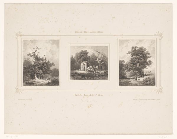 Curator: This print from the 1850s by Carl Friedrich Würthle presents two distinct landscapes, titled "Gezicht op Allgäu en een gezicht op de ruïne van Salzburg." Both views are captured in engraving on toned paper. Editor: They're rather melancholic, aren't they? I see a subdued world of greens and grays, a certain fading beauty. The paper itself looks aged, which somehow heightens that wistful feeling. Curator: Indeed. Würthle's romantic style, tempered with a touch of realism, renders the German countryside with a somber quality. Consider how the placement of these images reflects cultural values: the romantic Allgäu versus a specific ruin. Each presents very different ideas, one emphasizing an idealized space and another looking at something crumbling away. Editor: Absolutely, that positioning really makes you wonder. I am drawn particularly to the composition of the lower image; that dark, arching treeline feels almost theatrical. And what about those little figures? They add a spark of narrative, I can imagine myself right there with them on some literary pilgrimage. Curator: Right, that is likely intentional. Genre painting like this catered to bourgeois audiences, emphasizing connection through shared emotional and cultural memory, reflecting the societal preoccupation with nature, history, and their own identity during the Romantic era. These serene images reinforced national ideals while selling nicely in local print shops. Editor: They have such intimacy about them that feels quite the opposite of nationalist! All that romanticism probably helps you forget these prints are about control and cultural positioning. I'm actually thankful this old paper lends them that aura of vulnerability. Perhaps they resist their history slightly, reminding us not to idealize either landscape or the politics of pretty images. Curator: A lovely sentiment, a necessary counterbalance to Würthle's intent perhaps. Editor: Agreed, so I'll leave here thinking about art and its strange dialogue with the present and its own time, a good thing.