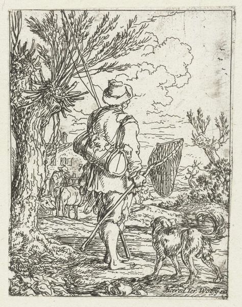 Editor: This is Johann Gelle’s “Blind in de Liefde,” an engraving from 1624. It shows a disheveled man being led by a dog with what appears to be a rather unforgiving landscape in the background. There is a sombre, perhaps melancholic feel to the piece. How do you interpret this work? Curator: It’s important to recognize how images like these reinforced social hierarchies in the 17th century. Gelle presents a figure who seems dependent, possibly seen as a burden to society. How does this image participate in the early modern discourse about disability and poverty? Consider, too, the gendered aspects: the two women in the scene appear trapped inside and complicit. Editor: So, you're saying the engraving reinforces the stereotype of vulnerable people being social outcasts, therefore promoting that view? Curator: Precisely. Look at the symbolic weight placed on the dog, a figure of low social standing forced into service, almost as vulnerable as its master. Then consider the title itself: is Gelle commenting on the foolishness of dependence, or the inherent cruelty of love when social systems privilege some and exclude others? Where does agency reside, if anywhere? Editor: The landscape almost seems to mirror his state: barren, with a distant church offering perhaps empty promises of solace. Curator: It’s a potent representation. The dog also leads me to consider ideas of human and animal relationship. Often marginalized humans share many experiences of marginalization and solidarity with non-human animals. Are we complicit when the dog leads this “blinded by love” person onward toward his bleak fate, the future out of the frame of this piece? Editor: I hadn’t considered the piece through such an intersectional lens before, viewing how poverty, gender, and perhaps even species all play a role in perpetuating systemic oppression, now and then. Curator: That’s the beauty of looking at older artworks; their legacy and symbolism offer the possibility for relevant contemporary discourse, reflecting issues from a new angle and creating empathy with the most invisible actors in a historical era.