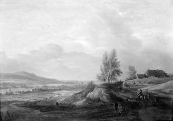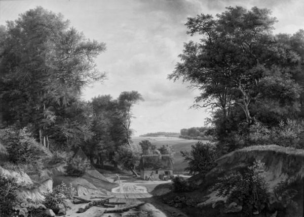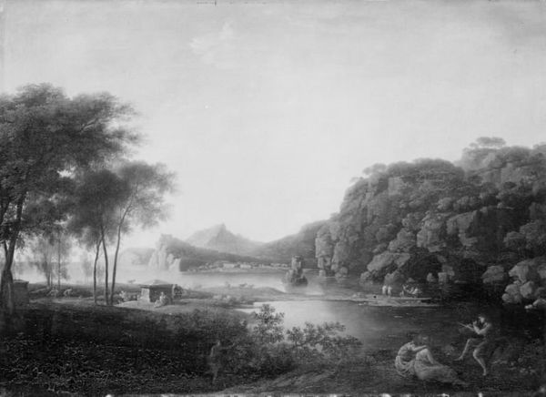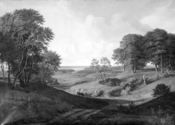 Editor: So, here we have "Nordsjællandsk landskab. I baggrunden den svenske kyst" painted by J.P. Møller in 1841. It's an oil on canvas, and it strikes me as quite melancholic, perhaps because it’s entirely in monochrome. What stands out to you in this piece? Curator: The most striking thing, perhaps because it lacks color, is its connection to a broader European Romantic sensibility. Landscapes were not simply records of places; they were statements about national identity and the artist’s subjective experience. What political undercurrents do you think this picture engages? Editor: That's interesting! I hadn’t considered it as a political statement. Given it's an 1841 landscape showing the Swedish coast in the background, perhaps it speaks to a sense of longing or connection with neighboring countries during a time of emerging nationalisms? Curator: Precisely. Remember that the 19th century was a period of significant national self-discovery. How does the absence of people in the painting impact its meaning, particularly considering the historical context? Editor: Without figures, the landscape feels more monumental, enduring, and perhaps even a bit idealized. It allows the viewer to project their own emotions and sense of belonging onto the scene. The Swedish coast in the distance hints at possibilities beyond the immediate Danish landscape. Curator: Good point! The scene promotes a shared, geographically rooted, cultural heritage. These kinds of depictions, circulated through art exhibitions and reproductions, played a role in shaping a collective imagination. How might it be seen differently today? Editor: Today, it makes me think about environmentalism. The untouched feel of the land contrasts so sharply with our current environmental concerns and perhaps it calls on the viewers to consider landscape's value. Curator: Indeed, shifting contexts radically transform the artwork’s public function and reception. It makes one wonder about art’s future role. Editor: I never would have considered that looking at a landscape. It’s fascinating to learn how a work's context influences our interpretations!