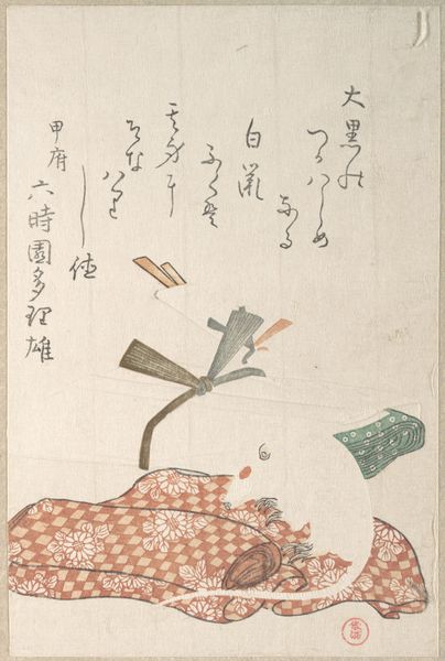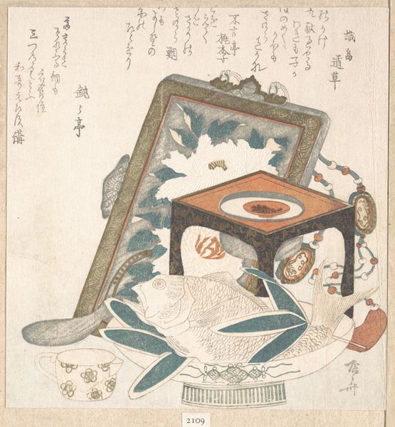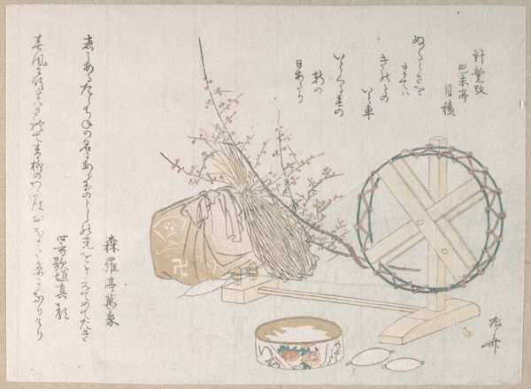 Editor: Here we have "Candle-Stand and Fan" by Kubo Shunman, created in the 19th century. It's a beautiful painting, using watercolor and printmaking techniques, and it has a wonderfully delicate, almost ephemeral quality. What's particularly striking is the juxtaposition of the mundane, like the candle stand and fan, with what appears to be accompanying calligraphy. What do you see in this piece? Curator: I see a commentary on the transience of beauty and the role of art within society. In Ukiyo-e prints like this, these seemingly simple objects carry rich cultural significance. The fan, for instance, was a popular commodity but also an emblem of status, adapted in artistic form into the orientalist aesthetic. This juxtaposition offers us insight into social stratification of 19th century Japan, where artistic expression catered to, but also reflected the aspirations of different classes. How do you perceive the artist's inclusion of text? Editor: Well, it gives the artwork an added layer, almost like a personal narrative woven into the visual representation. It’s not just about depicting objects, it’s about creating a complete sensory experience. It encourages a kind of deeper engagement with art, placing it in society and adding to its purpose beyond just aesthetics. But do you think the choice of subject matter reflects any wider trends in the art world at that time? Curator: Absolutely. The focus on everyday life in ukiyo-e prints responded to a growing urban culture, catering to a merchant class eager for accessible and relatable art. The inclusion of calligraphy was also a way to elevate the status of these prints, associating them with more traditional forms of art and knowledge production, thus legitimizing them within the broader cultural landscape. Considering its place in The Met's collection, how do you think its perception might have shifted for contemporary audiences? Editor: It's really thought-provoking to think about how the original cultural context impacts modern interpretation. Now it's displayed within a very specific institutional framework. It gives rise to reflections on both its value and preservation as historical heritage. Thank you. Curator: Indeed, examining art within its socio-historical framework, and how the passage of time influences our perception is truly rewarding.