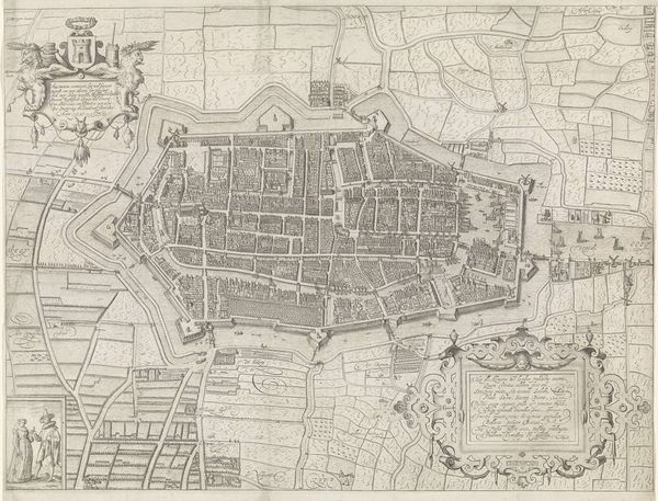 Adam van Vianen I created this intricate map of Utrecht with ink around the turn of the 17th century. Three distinct horizontal layers structure the composition: two eye-level cityscapes sandwich an aerial view of the city. Note how van Vianen renders Utrecht not just as a physical space but as a network of signs. Each building, canal, and street is meticulously drawn, forming a complex semiotic system. The aerial view transforms the city into a legible text, inviting us to decode its underlying order. This structured representation reflects the period's fascination with rational planning and control. Consider how the interplay of perspective and scale challenges fixed viewpoints, destabilizing conventional modes of representation. Van Vianen's Utrecht operates as both a practical tool for navigation and a philosophical statement about humanity's ability to understand and organize the world. This engraving isn't just a map; it's a carefully constructed vision of urban space.