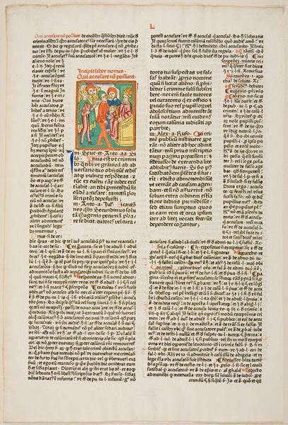 Editor: Here we have a page from an anonymous, undated book, featuring a woodcut print titled "Moses Receiving and Giving the Tablets of the Law" from the Harvard Art Museums. The vibrant colors within the initial "D" draw my eye immediately. What do you see in this piece? Curator: Well, the illuminated initial itself functions as a visual symbol. The letter frames the narrative of Moses, linking him to the divine word. The border is teeming with foliage, suggesting a world blessed with abundance due to adherence to God’s law. Do you see how that relates to cultural memory? Editor: So, the image serves as a reminder of the covenant between God and the Israelites, promising prosperity in exchange for obedience? Curator: Precisely. This isn't just a pretty picture; it’s a condensed theological argument embedded in a visual form, constantly reminding the viewer of their cultural and religious obligations. Editor: I see it now! The symbols carry so much more weight than I initially thought. Curator: Yes, and understanding these symbols helps us connect with the past.
