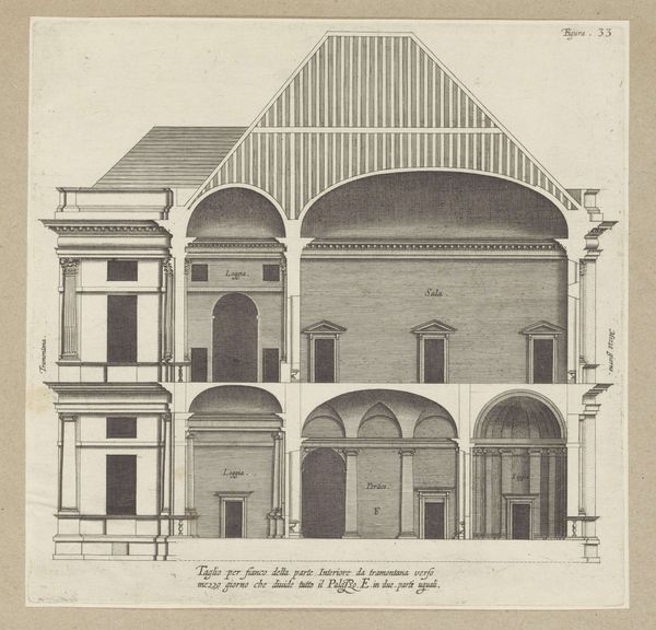 Editor: Here we have Nicolaes Ryckmans' engraving from 1622, "Opstand van de façade van de villa Pallavicino delle Peschiere te Genua." It's strikingly symmetrical, almost like an architectural blueprint. What stands out to you when you look at it? Curator: The precise linearity, the relentless geometric arrangement, presents us with a powerful essay in controlled space. Consider the stark contrast between the solid, shaded rectangular forms of the windows and the graceful curves of the arches. How does that tension speak to you? Editor: It creates a sort of restrained energy. The arches want to flow, but they're held in check by all those straight lines. Is that tension a feature of Baroque style architecture generally? Curator: Indeed, the tension arises from the push-and-pull dynamic between classical ideals of order and the emerging Baroque aesthetic. Look closely at the pillars - how do their placement and proportional relationships dictate the reading of the façade? Editor: They create rhythm, separating the windows into distinct units, but still adhering to the strict symmetry. So, it's not just decorative; it structures how we perceive the building. It seems as if the architect wanted to present an almost mathematical elevation. Curator: Precisely. Ryckmans, through the clarity of his engraving, dissects and presents to us the very logic underpinning the architectural design. What thoughts does that provoke? Editor: I suppose I hadn't considered how much of an argument a simple building façade could make. This makes me want to seek out more architectural engravings. Curator: Yes. It invites us to decode not just the building, but the mindset that conceived it. We begin to grasp that a well-ordered facade embodies ideals.