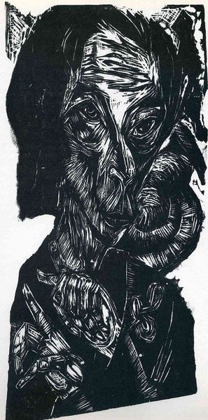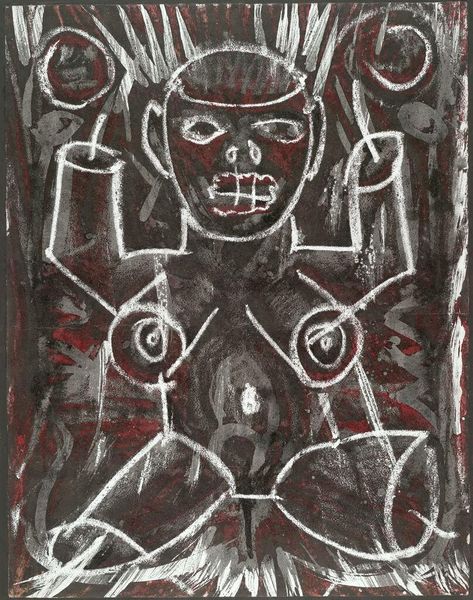 Curator: This is Jean Dubuffet's "Monsieur Plume with Creases in his Trousers (Portrait of Henri Michaux)," currently residing here at the Tate Modern. The support measures approximately 130 x 96 cm. Editor: My first impression? A ghostly bureaucrat. He looks like he's made of old bones and moonlight, all sharp angles against that unsettling dark ground. Curator: Dubuffet, as a key figure in Art Brut, often challenged conventional notions of beauty and representation. Consider the context: postwar Europe, a deep distrust of institutions. Editor: Right, and that raw, almost primitive style? It feels like a rejection of everything polished and refined. Like he’s scraping away the surface to reveal something… unsettling. Curator: The title itself points to a kind of absurd specificity, highlighting mundane details even as the overall image is so abstracted. Editor: I love the tension between the formal title and the image. It's like a cosmic joke, hinting at a deeper unease beneath the surface of respectability. Well, that was wonderfully macabre! Curator: Indeed, a fitting end to our exploration of Dubuffet's defiant vision.