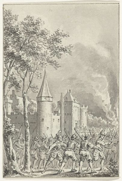 Curator: This etching by Franciscus Mattheus Jozef Kierdorff depicts the fire in St. Bavo's Cathedral in Ghent, back in 1822. It's titled simply, "Brand in de Sint-Baafskathedraal te Gent, 1822". Editor: A chilling image. The cathedral looms, magnificent yet vulnerable, and that plume of smoke... it evokes such a powerful sense of loss and anxiety, wouldn’t you agree? Curator: Absolutely. Kierdorff has really captured the drama, the raw emotion of the event. Notice how he contrasts the solid, almost stoic architecture with the swirling chaos of the fire and smoke. The fire in itself represents an interruption to what once was: time, history and continuity disturbed by socio-political forces. Editor: And look at the crowds! The artist conveys a feeling of unity during a tumultuous time, don’t you think? It’s a bit staged as a representation, perhaps intended to calm public fears at a time where anything could happen given previous historical upheavals, but this speaks to Romanticism’s vision of community. Curator: I think there's a cultural anxiety present. Buildings are important because they become ingrained with personal, communal memories, especially churches that host significant life events like baptism and funerals, among others. When that continuity is disrupted, people grieve on an unconscious level. It has a real psychological effect. Editor: Yes, the social role of art is palpable here. This work seems to perform damage control. The almost journalistic rendering creates a record—and, importantly, a visual narrative that served a very specific function in that era, to reassure while informing. It is quite a balancing act. Curator: These buildings, churches especially, can be viewed as large containers for all of our projections and fears, too. I believe that the burning down of important sites can sometimes trigger collective and traumatic memories and anxieties of when things were also up in flames. Editor: Definitely a disruption, then. It highlights the transient nature of material culture while hinting at longer cultural arcs. Well, thanks for this tour; seeing how socio-political anxiety and faith are mirrored makes me think differently about architecture and iconography. Curator: And for me, it is amazing how an image can unlock the intersection of history, collective trauma, and artistic intention, adding to a tapestry of symbols of how we have collectively responded to it.