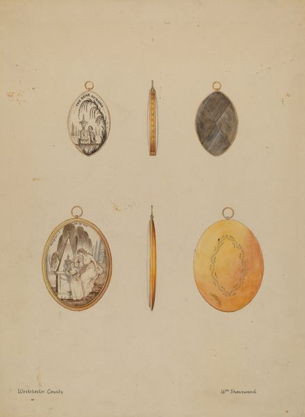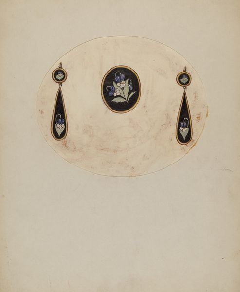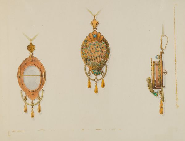 Walter W. Jennings made this watercolour design for "Earrings" sometime during his lifetime, and it's interesting to consider the amount of precision he employed. Look closely, and you will see the black pigment is laid down in thin washes, with only minimal variation in tone, giving a striking contrast with the paper. The earrings are depicted in three different perspectives, as if Jennings was showing off all angles of his design. The highlights, achieved by leaving small areas of bare paper, give the impression of light reflecting off the jewellery, an additional dimension that adds to the sense of realism. It's interesting to imagine the kinds of tools Jennings may have used. Were they fine brushes, or did he apply the paint with something else? The design here is a commercial one, an idea which may then be translated into being worn, an everyday and often overlooked form of adornment. In the same way, perhaps another artist such as Man Ray can be seen to embrace a similar sensibility, as they combine a high level of finish, with an appreciation for the everyday. There’s space for both!