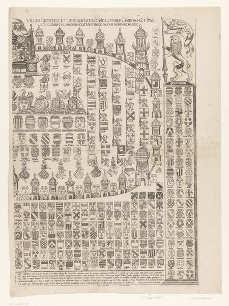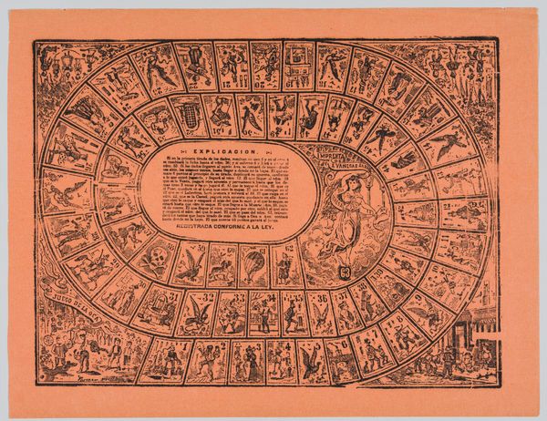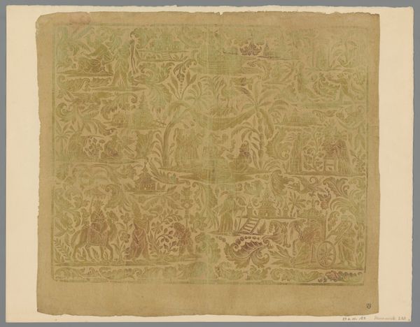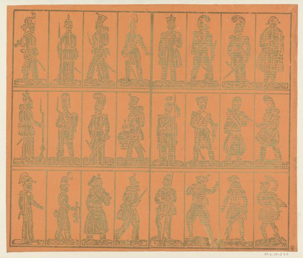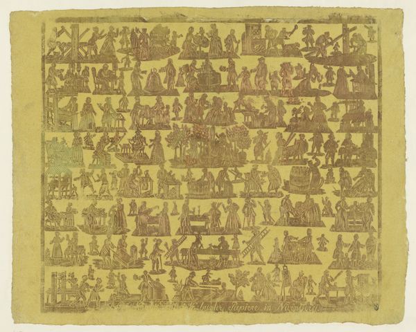 This print titled 'Blad met twaalf ambachten in drie rijen van vier kaders' was created by Dessauerschen Buntpapierfabrik. The sheet is divided into twelve distinct frames, each illustrating a different craft. The frames are arranged in a grid-like composition, a formal structure that brings order to the variety of scenes. The use of contrasting colors enhances the graphic quality of the print. The scenes are rendered with a linear quality, emphasizing form and action. The artist has used a range of marks, from the delicate to the bold, to create texture. This attention to the materiality of the printmaking process invites reflection on the structural elements. The semiotic system in the work can be interpreted as a celebration of labor and the material world. The repetitive nature of the grid suggests the industrial processes. The formal qualities of this print underscore its cultural function. It captures a moment in time. The grid format serves not only as an aesthetic choice, but also as a framework for organizing and understanding the world of work.