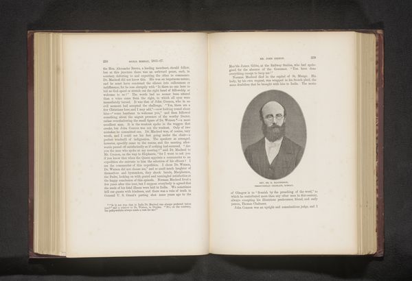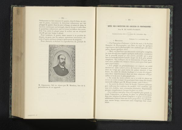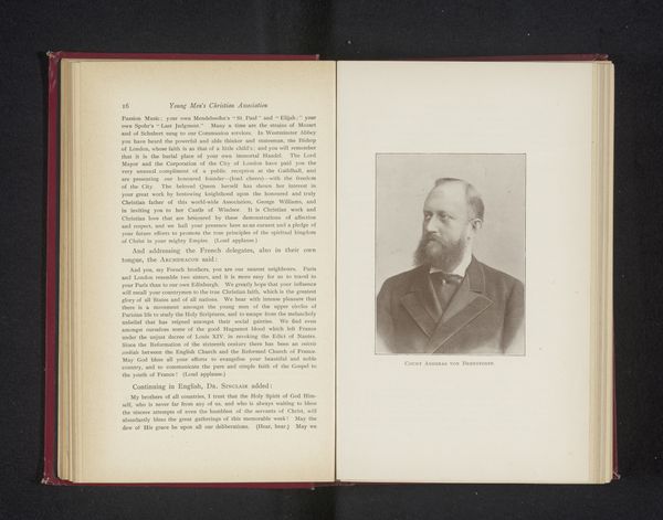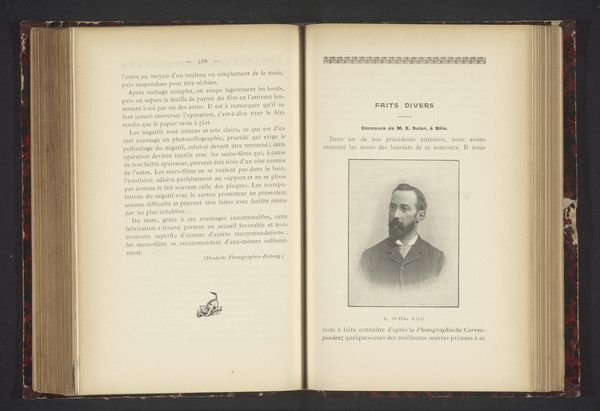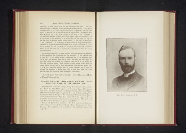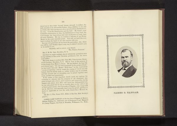 This sepia photograph of Constantine C. Esty, of unknown date, is pasted into a book whose pages are visible to either side. Its pale colours and sepia tones suggests it is a photogravure print, lending it a delicate, ethereal quality. The subject is framed by an ornate, rectangular border adding a sense of formality and historical distance. The composition balances the interior world of the book with the public persona of Esty, creating a dialogue between private memory and public representation. The open book format invites us to consider the photograph not as an isolated image, but as part of a larger narrative. Semiotically, the photograph functions as a signifier of memory and history, its aged tones evoking a sense of nostalgia and the passage of time. The photograph's integration within the book prompts questions about the nature of biography and representation, highlighting how individual lives become embedded within broader cultural and historical narratives. This layering of images and text challenges us to rethink fixed meanings and explore new ways of understanding the relationship between image, text, and memory.