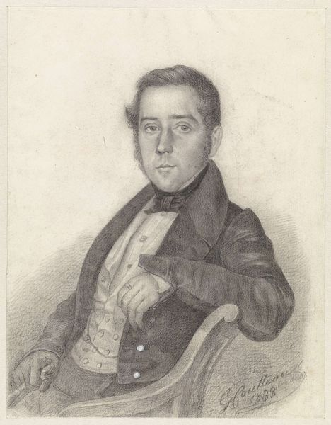 Curator: This pencil drawing, titled "Zelfportret van Jacobus Pelgrom," was completed in 1859 and resides here at the Rijksmuseum. What strikes you most about this self-portrait? Editor: It’s the intensity in his gaze, really. Even with the delicate pencil work, there's a palpable seriousness. You can sense the artist grappling with identity, performance, and self-representation through this medium. Curator: Exactly. The institutional framework of art production during the Romantic era placed significant emphasis on the artist's subjective experience. Pelgrom uses the relatively accessible medium of pencil to create an intensely personal, yet undeniably public, declaration. Editor: But doesn't the choice of pencil drawing challenge notions of high art? The softness feels almost vulnerable, pushing back against the bravado often associated with self-portraits commissioned in oil by established artists of that time. What position does this medium grant the artist? What agency? Curator: I think that’s right. Think about class and accessibility. Pencil drawings, especially in the mid-19th century, are not exclusive to the dominant societal groups and ruling classes. This allows for an intervention that circumvents traditional gatekeepers and speaks to the democratization of image making in response to academic standards for success. Editor: A silent revolution, in graphite! This could be viewed as a self-validation ritual for someone without access to elite resources. I read the face too as not entirely certain, like he's investigating what his social position could be through portraiture. Curator: Indeed. The act of portraying oneself becomes an act of self-definition. Pelgrom's choice subverts those expectations and forces us to confront the complex power dynamics embedded in the very act of artistic creation, making it a commentary on its time, not just a likeness of a man. Editor: And maybe in considering what success meant to an artist during his time, we should pause on the success of Pelgrom’s attempt, centuries later, to still speak so directly to viewers like us.