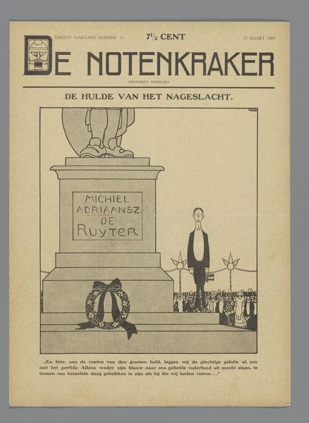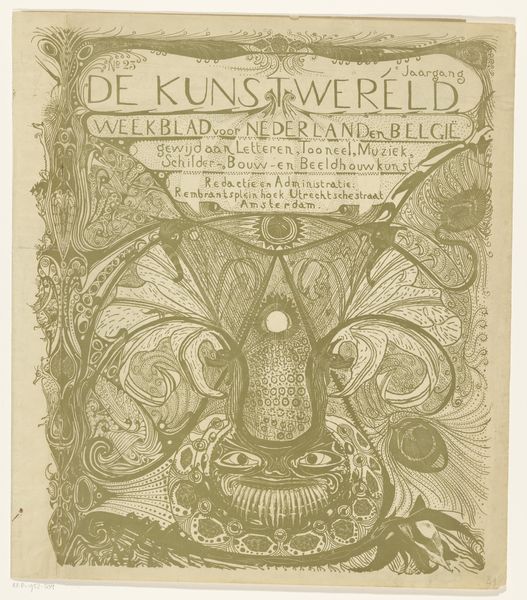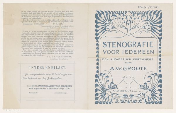 Curator: We're looking at a poster, “Affiche ter aankondiging van het tijdschrift ‘De Kroniek,’” likely from 1895, designed by Theo van Hoytema. It resides here at the Rijksmuseum. Editor: It's striking. Immediately, I'm drawn to the elegant, almost mournful atmosphere created by the monochromatic palette and those brooding storks. Curator: Hoytema was a master of lithography. This print beautifully showcases the Art Nouveau style and its engagement with symbolism, very much of its time. 'De Kroniek' was a journal keen to promote the arts, and this design is clever. Editor: Clever in what way? Curator: The storks evoke a certain Dutch pastoralism, even if tinged with melancholy. Storks themselves often symbolize, new life and domesticity, but their gaunt postures suggest the opposite in this visual context. Is 'De Kroniek' subverting the notion of home in some way? Editor: It’s the journal’s title at the top, rendered in that ornate, almost fairytale-like lettering, coupled with a progressive listing of contributors, signalling its place as a prominent cultural outlet. But beyond a visual hook, who was this artist and why are birds so central to his practice? Curator: Hoytema's work often featured birds, reflecting his deep interest in ornithology, he really put the nature he encountered around him front and centre. But as we peel away those nature layers we also confront something deeply rooted in social class: the journal's aim was progressive in design and sought a wide audience via subscriptions advertised at the bottom. The artist designed pieces which at face value were "pretty," or easy on the eye for audiences in an emerging consumer culture but the contents it held discussed socialist issues. Editor: So there's a play here: nature and ornithology for aesthetics while progressive thinking sits underneath. That blend speaks to broader trends as cultural output found ways to promote liberal, socialist, even anarchist philosophies and political thought. Curator: Absolutely, there's a real tension between decoration and societal critique here, something that often gets missed. I’m glad we drew that out. Editor: It gives me a fresh way of considering art’s dual role, that art can serve aesthetic and political functions, reflecting the tensions within society itself.
