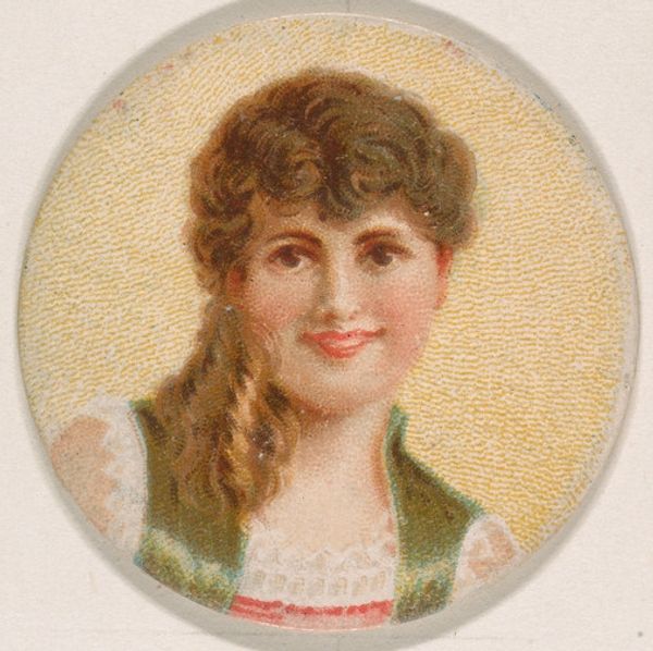 Editor: Here we have "Portrait of Woman," a lithograph print from 1889 by Kinney Brothers Tobacco Company. It's a very sweet, almost sentimental depiction. What strikes you about this piece? Curator: The immediate thing that stands out is its origin: a tobacco company. This wasn’t fine art; it was promotional material. Who was the intended audience, and what narrative was Kinney Brothers selling along with their tobacco? This image embodies the ideal of feminine beauty at the time—a white, youthful face representing purity and domesticity. But what does it conceal? What were the lives of women who didn’t fit that mold? How does this portrait contribute to a limited and exclusionary beauty standard that continues to affect us today? Editor: So, you see it as less a portrait of an individual, and more of a… symbol? Curator: Precisely. The “Portrait of Woman” flattens female identity into a commodity. Consider also that it's disseminated alongside tobacco, another commodity, deeply entangled with colonialism and exploitation. The layering is dense. Who benefits from idealizing women, and what systems does it reinforce? What if, by understanding and criticizing those mechanisms, we take steps toward dismantling and reinventing how we value people, and even art itself? Editor: That gives me a lot to think about – how something seemingly innocent can actually uphold certain power structures. Curator: Exactly. Keep questioning what we accept as “normal.” Critically examining how artworks reflect and shape societal norms is key. Editor: This has broadened my understanding of art's function beyond mere aesthetics. Curator: And I'm glad we could use a simple tobacco card to start thinking critically.