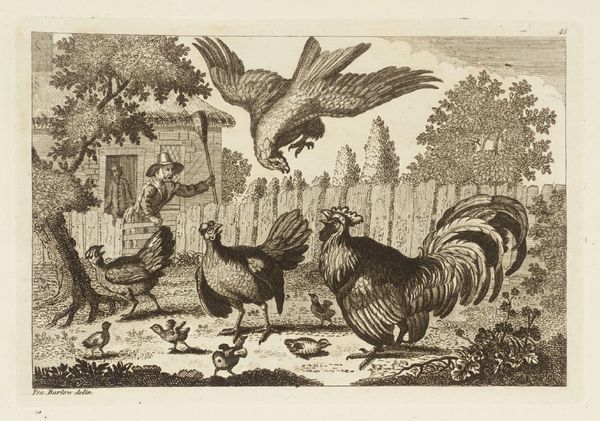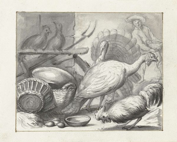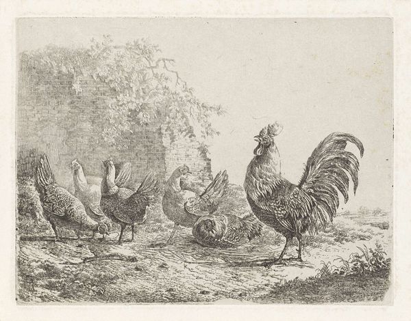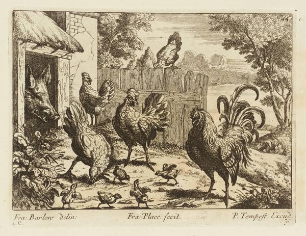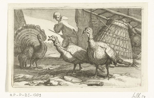 This detailed etching of fowl is by Jan Griffier the Elder, created around the turn of the 18th century. Griffier, born in Amsterdam, later settled in London, and his landscapes and animal studies reflect the influence of both Dutch and English artistic traditions. This piece offers a glimpse into the agricultural landscape and the relationship between humans and animals during that era. Note the variety of birds: turkeys, chickens, and other fowl, each rendered with attention to detail. These animals are not merely decorative; they are indicative of the period's agrarian economy, where livestock played a central role. Consider the cultural context: images of fowl were popular, reflecting both an interest in the natural world and the economic importance of these animals. Griffier’s work invites us to reflect on how we perceive and interact with the animal world, and how these perceptions are shaped by cultural and historical forces.