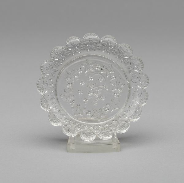 Editor: Here we have an intriguing piece, simply titled "Cup Plate," created around 1826 or 1827 by an anonymous artist. It's made of glass and part of the decorative arts. I’m immediately drawn to the intricacy of the design; how would you interpret this piece focusing on its visual and material elements? Curator: Focusing on its form, the transparency and refractive qualities of the glass are paramount. The artist, although anonymous, clearly possessed a sophisticated understanding of mold-making. Notice the concentric rings of patterned texture; they draw the eye inwards. Consider the relationship between the smooth, clear glass and the densely patterned areas, especially in relation to how light interacts with each distinct texture. How does this play with your sense of visual depth and tactile interest? Editor: It's fascinating how the light interacts, creating such a subtle visual depth with a simple, clear medium. I didn't fully appreciate the tactile element you pointed out; it feels like I should be experiencing this by touch, too. Is there anything further to decode within its composition? Curator: Indeed. Delving deeper, note the interplay between radial symmetry and subtle asymmetry, especially noticeable in the floral and foliate elements towards the center. Semiotically, the patterns are of great interest, as there are floral elements arranged as decoration, combined with geometrical elements. What can you say about that formal relationship, then? Editor: I see a balance and counterpoint in the piece; one that invites the eye to consider both the precision of manufactured decorative wares combined with more free-flowing aesthetic of decorative elements. Curator: Precisely. Reflecting on this, the formal rigor combined with decorative flair offers a glimpse into early 19th century design sensibilities.