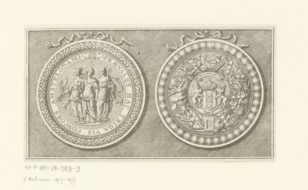 Editor: So this is Erling Eckersberg’s "Medalje over Thorvaldsen," an etching from 1850. It’s a print of two medallions, I believe? The detailing is incredible. What strikes you when you look at this piece? Curator: The process of reproduction here is quite interesting. Eckersberg, likely responding to Thorvaldsen's fame, created this print. But consider the implications: the original sculpture, undoubtedly an expensive object crafted with skilled labor, is here made accessible, replicable, consumable through the relatively inexpensive medium of printmaking. This act democratizes Thorvaldsen's image. Editor: I never considered that. So it's not just about admiration, but about access to art as a commodity. Curator: Precisely. Look closer: academic art of this period frequently referenced classical themes and forms, but what happens when that high art reference becomes something easily circulated and even collected? Where do we draw the line between art object and product? Editor: It definitely blurs the lines. The print transforms the medal into something easily owned and distributed, diminishing its uniqueness perhaps. Curator: Exactly! And in doing so, it asks us to consider the social and economic factors at play in the art world – the labour involved, the means of dissemination, the target audience, and, ultimately, consumption. Are we meant to view Thorvaldsen as an artistic genius, or a brand? Editor: I see what you mean! Thinking about the print as a commodity that makes art accessible changes everything. I’ll never look at etchings the same way. Curator: It forces us to interrogate how value is assigned not only to art, but to artists themselves, and the labor which produced it all. Hopefully you can apply this perspective on other forms of visual production now!