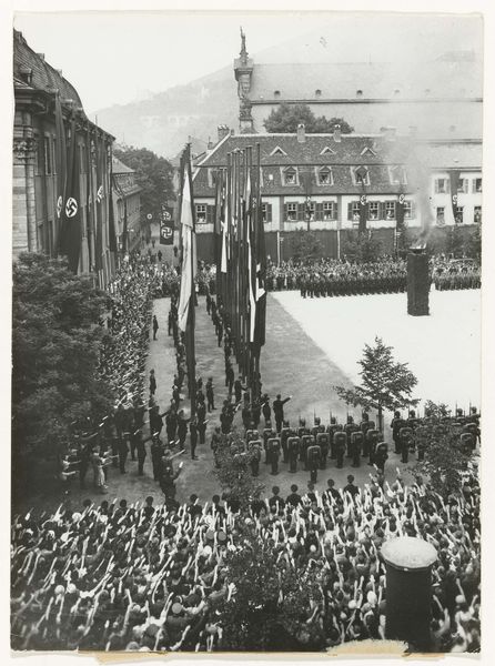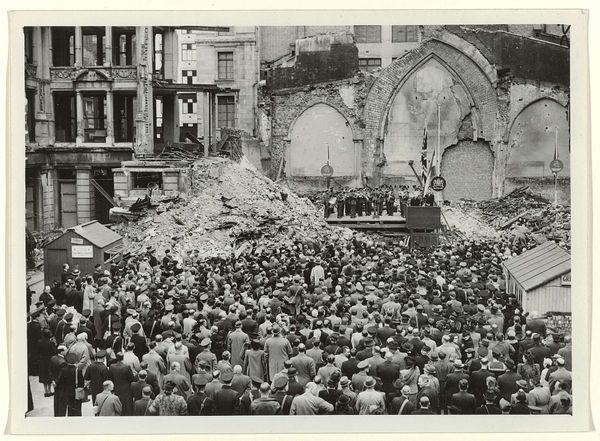 This black and white photograph captures a parade on the Dam Square in Amsterdam on June 28, 1945, during the liberation festivities. What strikes me first is the careful arrangement of elements, where the orderly rows of soldiers contrast with the festive chaos of the decorations above. It's all about seeing how these contrasts work together. The physical details—the grainy texture, the way the light catches the edges of the buildings and the soldiers’ uniforms—give it an immediate, visceral feel. See how the photographer frames the shot? The eye is drawn to the center, to that strange, almost alien structure hovering over the square. Is it a symbol of hope, or a reminder of the upheaval they’ve all just been through? It reminds me a little of some of Gerhard Richter’s blurred photographs. Like Richter, this anonymous photographer seems less interested in capturing a perfect image than in conveying a sense of atmosphere and emotion. There’s no right or wrong way to interpret it, and maybe that’s the point.