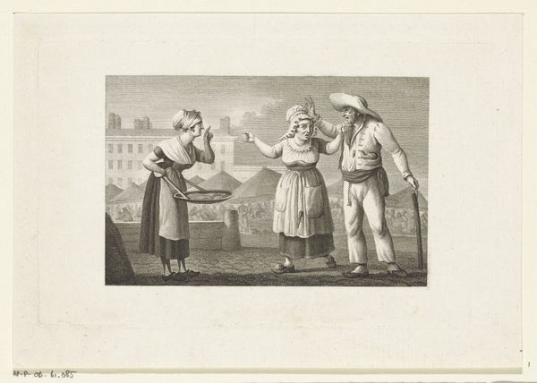 Curator: Bartolomeo Pinelli's etching from 1819, titled "Romeins kind leert lopen" or "Roman Child Learning to Walk," offers a glimpse into 19th-century Roman life. Editor: It has an intimate, almost mundane quality about it. You see the textures of the clothing rendered simply, but with great clarity, emphasizing the weave of the fabrics and the construction of that peculiar walking frame. Curator: Exactly. That "peculiar walking frame" tells us a lot. Not all children had access to such contraptions; it hints at a certain social class. Look at the positioning of the parents too; the father's casual posture suggests his role within the domestic space, while the mother's tender support speaks to prevailing expectations about caregiving. Editor: I'm drawn to the etching technique itself. The clean lines and meticulous cross-hatching, clearly showcase a detailed reproduction through industrial printing, where you could reproduce an intimate scene. It opens a much wider reach for people who consume these kinds of artworks. Curator: Right. And consider Pinelli's larger body of work. He consistently depicted Roman customs, often focusing on the lives of ordinary people. He was attempting to create an Italian national identity, which excluded minority, displaced groups like the Sinti, Roma communities which coexisted and were indigenous to the area at the time. The focus on quotidian Italian-ness reflects and perpetuates a narrow view of culture and race. Editor: So you see the piece almost as a document of social conditioning. To see, even in these images of apparent innocence, you observe something insidious around constructions of nationhood. Curator: Yes, the composition, combined with the medium itself, works on the viewer. And, even though this etching shows a child learning to walk, perhaps the parents represent the expectations weighing heavily on their child and on the very idea of an ideal childhood in that time. It makes you consider how gender and status, as they existed back then, impacted the way people grew up and were taken care of. Editor: Seeing this, I notice so many tiny features in how people lived everyday back then, even within the same space as magnificent, imperial ruins, a juxtaposition worth pondering. Curator: It certainly provides a starting point to unpack many facets of Roman society back then.