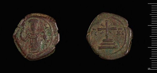 Editor: This is a Follis of Tiberius II, Antioch on the Orontes. Looking at the coin's relief and the weathering, I find myself wondering about the marks of time. How do you approach interpreting this kind of work? Curator: Consider the materiality. The wear on the coin, the eroded details—these are not imperfections, but integral components of the artifact’s form. They articulate its history as surely as the emperor’s effigy. Note, too, the incised lines which create the images and text. Editor: So, the coin's physical state is itself a key element? Curator: Precisely. The composition balances imperial authority with the abstract symbolism of power. The medium and its degradation become inseparable from its meaning. Editor: That gives me a lot to think about. I see the coin in a new light now. Curator: Indeed, examining the intrinsic qualities of an object refines our understanding.