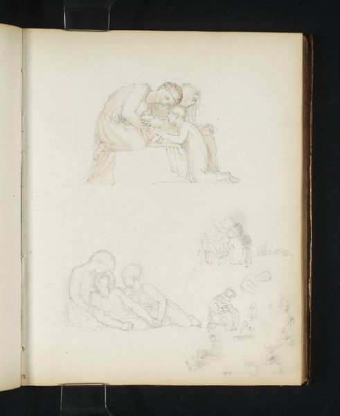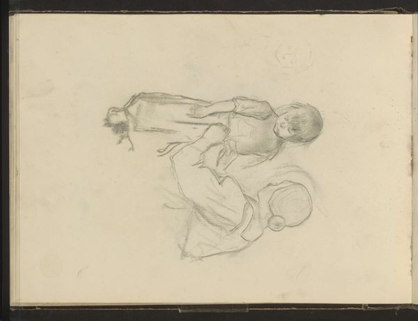Curator: This drawing, aptly titled "Knielende en staande man," roughly translated as "Kneeling and Standing Man," hails from the sketchbooks of Johannes Bosboom and resides here at the Rijksmuseum. Executed in pencil on paper sometime between 1827 and 1891, it provides an intriguing glimpse into the artist's process. Editor: It strikes me as remarkably vulnerable. These are two rather intimate, unassuming postures captured so plainly, it almost feels like stumbling upon a secret. Curator: The beauty of this lies in the raw, unfiltered form. The structural composition directs us immediately to the figures; the gestural lines and lack of embellishment force engagement with form. Consider how Bosboom uses shading to indicate volume without defining precise contours, creating depth while maintaining a sense of incompleteness. Semiotically, the poses themselves imply narratives, hinting perhaps at a hierarchy or a moment of introspection. Editor: I get a quiet desperation vibe from the kneeling man. His form appears weighted. And the standing man… evasive? Almost turning away, maybe a discomfort there? The vagueness of the facial features amplifies the intrigue, allowing me to project a mood rather than a defined narrative onto the scene. It also lends to its universality; these are familiar postures we recognize, in turn projecting an image of mankind. Curator: Precisely. Bosboom manipulates simplicity to evoke broader meaning. The choice of pencil on paper further reduces visual noise, emphasizing the primacy of line and form. The monochromatic palette allows for meticulous tonal variations. Bosboom has very subtly explored human form using rudimentary artistic interventions. Editor: Ultimately, it is the sparseness of the piece which gets to me; how such little detail can hold so much depth is impressive. There's something haunting, yet human in the piece, despite its rough quality. Curator: Yes. This seemingly simple sketch underscores Bosboom’s deep understanding of form, posture, and the power of suggestion through minimal intervention. Editor: And I suppose that is what gives it that wonderful sense of immediate, raw emotional truth.