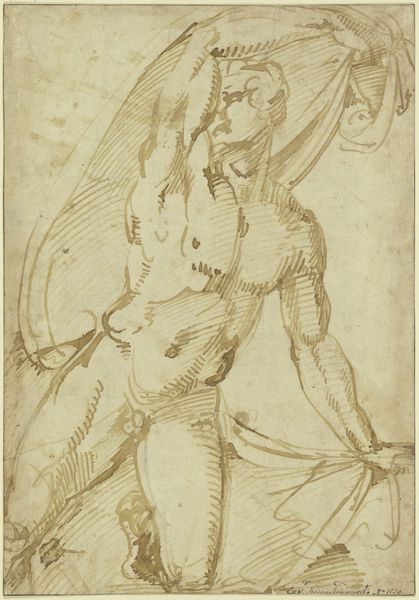 Stefano da Verona made this pen and brown ink drawing of a bearded nude male figure sometime in the early 15th century. This work provides insight into the cultural fascination with classical antiquity during the Early Renaissance in Italy. The figure's nudity, muscular build, and dynamic pose evoke the idealized forms of ancient Greek and Roman sculpture, reflecting a renewed interest in classical aesthetics. The figure also holds what appears to be a shield or musical instrument. It is unclear whether this drawing was intended as a study for a larger composition or as an independent work of art. Stefano da Verona was part of the International Gothic style which was characterized by elegant forms, refined details, and a decorative use of line and color, often drawing inspiration from both classical and contemporary sources. Art historians use drawings like this to understand the ways that artists looked to the classical past to create new forms of art, exploring the relationship between artistic creation and cultural values.
