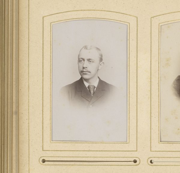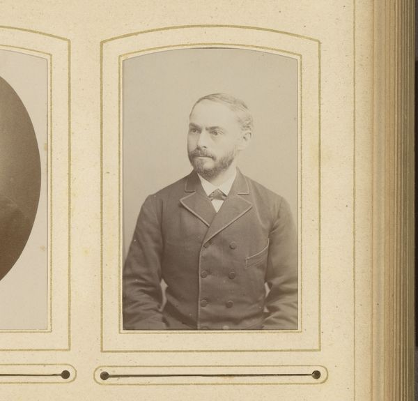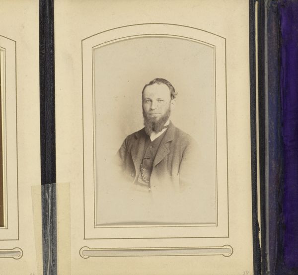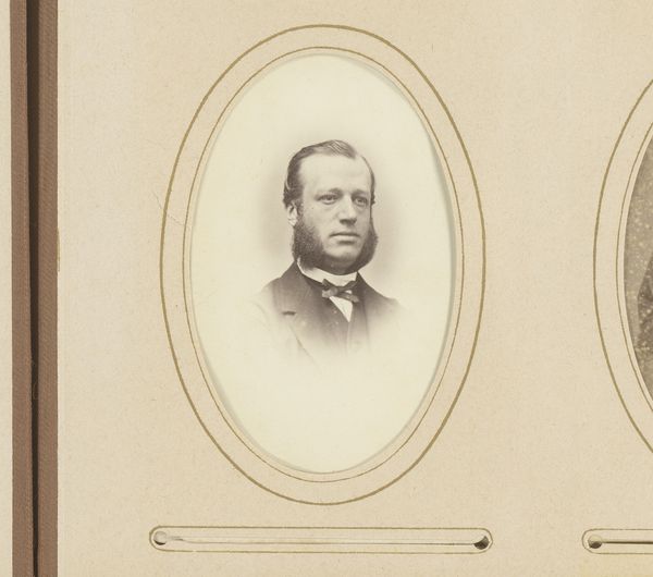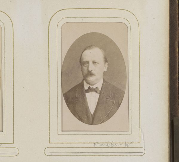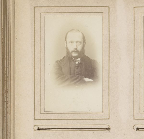 Curator: Looking at this gentleman, so formally posed, I can’t help but wonder about the role these photographic portraits played in solidifying social hierarchies. Editor: It's a classic representation of bourgeois values—stern, respectable. My immediate thought is of the gelatine silver print technique and the increasing industrialization of photographic materials in the late 19th century; its sharp, almost clinical quality feels markedly different from earlier photographic processes. Curator: Precisely. "Portret van een man met bakkebaarden," or "Portrait of a Man with Sideburns," attributed to Theodorus Diepenbach, likely between 1867 and 1877, offers a compelling case study of photographic portraiture's ascent during that period, when photographic studios flourished. This carte-de-visite format aided the normalization of picture production as social exchange. Editor: Yes, the physical qualities reinforce that sense. Gelatin-silver printing allowed for much greater consistency and ease of reproduction compared to, say, collodion. Also consider the albumen paper support used - these advancements enabled portraiture to be democratized and industrialized, affecting studios and their economics. Curator: And how that proliferation reshaped notions of the self and public image. These photographs moved beyond the domain of elite painted portraiture. Its mass production enabled access and documentation and a nascent culture of image dissemination. How did this shape identity or contribute to ideas around "celebrity?" Editor: An excellent point. It touches upon the societal relationship to materials themselves: mass produced, repeatable processes versus older crafted ones. The labor behind gelatin, the silver refining, even the specific chemical compounds—they speak to changing economies. Think of who controls their availability; even who labors in producing it matters! Curator: Absolutely! And the question of who could afford to participate in this burgeoning visual culture—who was depicted, and who wasn't—tells us much about social dynamics and evolving notions of status in late 19th-century Dutch society. Photography could democratize the image and also solidify social distinctions in new and more nuanced ways. Editor: So, considering the historical weight of imagery, contrasted with its production, hopefully, viewers recognize photography for its social context AND materiality. Curator: A dual approach lets us appreciate how societal forces converge to create potent cultural symbols.