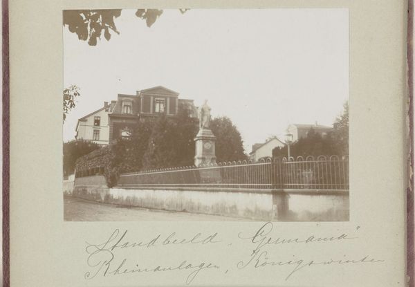 Editor: This gelatin-silver print, "Gezicht op pension Magdalenenhof, Königswinter," by David Vermeulen, circa 1895-1905, possesses such a muted, almost dreamlike quality. It’s very subtle and subdued, almost like looking at a faded memory. What catches your eye when you look at this image? Curator: The quietude, that sepia stillness, immediately evokes a powerful sense of nostalgia. Pictorialism, as seen here, isn't just about replicating reality; it's about evoking a mood. Look how the landscape blurs, creating a hazy, almost mythical place. Do you see how the Magdalenenhof, though seemingly a mundane subject, transforms into something almost symbolic, a potential sanctuary? Editor: I hadn’t thought of it as a sanctuary, but I see what you mean. The soft focus does lend it a certain timelessness, like a place outside of ordinary life. The vegetation almost protects it. Curator: Exactly! Consider the symbolic weight of a "Magdalenenhof” – a place perhaps associated with refuge, forgiveness, even transformation, echoing the biblical figure of Mary Magdalene. The photographer isn't merely documenting a building; he's capturing an idea. How do you think this would have resonated with viewers at the time? Editor: I imagine in a rapidly industrializing world, a place promising peace and refuge, even symbolically, would have been deeply appealing. It still is. Curator: Indeed. And isn’t it interesting how photographic images can be both records and symbols, acting on both our minds and our emotions through their symbolic and referential qualities? It really makes you think about the cultural power inherent in visual imagery. Editor: It certainly does. Thanks for making me look beyond the surface!