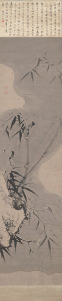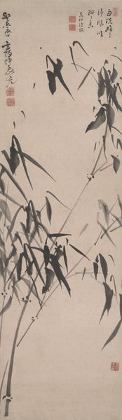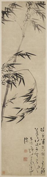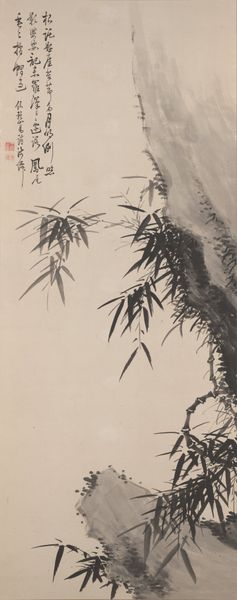 Curator: Here we have "Bamboo," a late 18th-century ink drawing by Kuwayama Gyokushū, held in the Minneapolis Institute of Art. Editor: It's so understated. My immediate impression is of quiet resilience, like nature calmly observing turbulent times. Curator: Exactly! Consider the materials—ink and paper. These weren't luxury goods; they were relatively accessible tools. Artists like Gyokushū would have trained extensively to achieve such expressive lines with simple materials. How the work was produced tells us much about craft and economy at the time. Editor: And, traditionally, bamboo represents qualities like uprightness and perseverance. Looking at the ink, I am wondering how that links back to resilience; Bamboo bends, it doesn't break. Also, the contrast of light and dark seems intentional—is it hinting at specific social inequalities of that period? Curator: It’s fascinating to view the historical and cultural landscape. During this period, the Tokugawa Shogunate was in decline, impacting artisans. Does this drawing represent that struggle and what does that do to Gyokushū’s identity in relation to it? Editor: Precisely. This era saw rising social unrest and shifting class dynamics. Viewing it today prompts us to ask—does the art serve the elite, or the common person? Does it become a reflection of national character, cultural protest, or a quiet acceptance of circumstance? The bamboo serves as both document and dream. Curator: The execution—the thin and broad brushstrokes; the deliberate blurring to create depth—it is an entire production and an important commentary. I really want to ask what type of paper was employed and its availability? Editor: When looking through that materialist approach, understanding both the accessibility and the intended audiences can further enlighten this piece beyond a quiet landscape study to reflect something about class and resistance. Curator: Examining “Bamboo” invites one to go beyond nature observation. What are your views? Editor: Definitely. This drawing isn't just about appreciating natural beauty, but also about recognizing the social commentary and production limitations and their combined message through cultural memory.