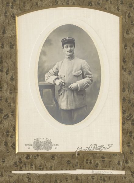 This is a photograph by Joseph Lazarus, depicting an unknown man in a nurse's uniform. The photograph’s sepia tone and the subject’s formal pose give it a distinct historical feel. The composition is structured around the stark white uniform, which contrasts against the soft, blurred background. The cross emblems on the cap and arm immediately signal themes of aid and sacrifice, yet the man’s ambiguous expression complicates any simple reading. The photograph employs a semiotic system, where the uniform and cross function as signs. These signs create meaning that is tied to cultural and historical contexts. The symmetry of the composition—the balance between the upper and lower body, the centered figure—suggests a desire for order and control. The slightly faded quality and the unknown identity invite us to consider how images construct and preserve memory. Consider the interplay between form and content, and how that creates a historical dialogue around identity, service, and representation.