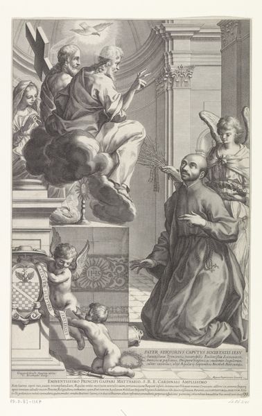 Curator: The emotional tenor of this engraving is set primarily by the striking contrast of light and shadow, wouldn't you agree? A definite moment captured in dramatic black and white. Editor: Absolutely. And what a charged moment it seems to be! This print captures H. Thomas van Villanueva. The engraving, created sometime between 1642 and 1685, is by Conrad Lauwers. There's a dynamic at play between power and need that begs unpacking. Curator: Yes, notice how the light concentrates upon Villanueva as a symbol of charity and spiritual grace, especially in conjunction with his halo. Then look around him: people who represent humanity are seeking solace. The symbolism is palpable; Lauwers understood well how to construct meaning through images. Editor: Exactly, Lauwers understands the power dynamics at play. Look at the visual construction: a clergyman distributes alms—redistributing wealth, we could argue—while angels literally crown his actions from above. The engraving almost normalizes hierarchical power structures of the time. Curator: The Baroque really used allegories like these to underscore complex ideological messaging. These artists are drawing upon deeply rooted visual systems, where giving is holy. Think of Christian iconography—offerings, saints, ascensions. All about what it means to attain higher spiritual consciousness through service. Editor: But what about the service performed for power structures? Doesn't this sanitizing of charity divert us from asking questions about systemic economic inequality? Where did this wealth originate that Villanueva is handing out? I keep seeing it as carefully manufactured consent, frankly. Curator: But perhaps both views hold truth. Religious institutions of the time operated as part of a larger web of governance, responsible, at least nominally, for their subject's welfare. The picture conveys genuine compassion while also adhering to an existing social contract, it seems to me. Editor: Maybe. What stays with me is how skillfully Lauwers distills multifaceted socio-religious elements into one easily "digestible" visual; almost as if he's teaching the viewer not what to see, but *how* to see it. Curator: I agree. Thank you, looking at Lauwers from that angle brought so much to light for me. Editor: Thank you. Your perspective really illuminated other aspects for me too.