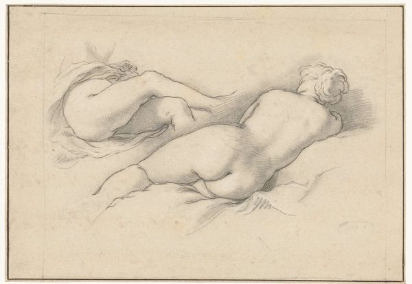 Jean Auguste Dominique Ingres made this drawing, Studies for the Cadaver of Acron, using graphite on paper. Immediately, the pale tonality of the graphite gives the scene a ghostly quality. Three studies of the male nude overlap each other on a horizontal plane. The artist is concerned with the interplay of light and shadow across the human form. Ingres carefully models the figures with subtle gradations, focusing on anatomical accuracy and classical ideals of beauty. Yet, in rendering the body as a cadaver, Ingres destabilizes these ideals. Death, a great leveler, challenges our perception of beauty, forcing us to confront mortality. The very act of studying a cadaver suggests a clinical, detached observation. Note how Ingres uses line to define form. The fine, precise lines create contours and volumes, yet also contribute to the drawing's overall sense of fragility and impermanence. This study exists as a testament to the artist's dedication to mastering form and anatomy, but simultaneously, a meditation on life and death.