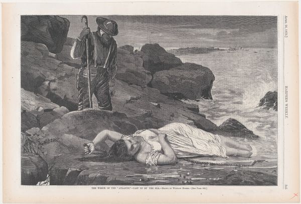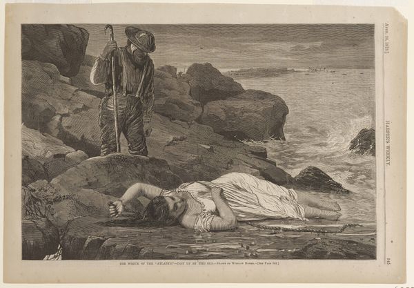 Curator: This watercolour drawing from 1828 by Martinus Rørbye is titled, "Two Warriors Find a Man Washed Ashore." It currently resides in the collection of the SMK, the National Gallery of Denmark. What do you think when you look at this? Editor: Well, I find the scene rather melancholy, though intriguing. There’s a feeling of stark loneliness on that beach, and the figures seem to be suspended between worlds, the earthy solidity of the coast against the ethereal expanse of the sea and sky. The monochromatic palette amplifies that feeling of melancholy, I think. Curator: I find it interesting how Rørbye employs primarily drawing techniques; pencil and watercolour to give form and texture to this narrative scene. We should consider how this speaks to Romanticism, a period where there was renewed interest in classical history and literary accounts. Editor: True, and consider the physicality, though. Rørbye had to find or create the pigments. This process is tangible in the work, and yet so very little information exists around that. Think of the hands involved, from mining the earth for materials to their transformation into the object we see now. It's not just art; it’s a chronicle of human labor, both the labour on view and the artist's labor we don't get to see. Curator: Indeed, the material processes underline the conditions under which art like this came to be. And those choices - to emphasize draughtsmanship as much as painting. Perhaps even reflecting economic restrictions that influenced material choices available to artists during this period. Editor: Yes! Also consider, if you will, how the scale lends itself to intimacy; the drawing asks us to come close, to share in the discovery and consider our own vulnerabilities through it, like stumbling upon an unstage scene, unexpected and vulnerable. Almost as vulnerable as Rørbye with pencil and brush trying to earn a living! Curator: Looking closer then, what might begin as the story of classical heroes shifts to become a poignant exploration of individual human struggles within wider material constraints of production during a burgeoning industrial age. Editor: It feels apt, then, that we conclude here, perched on the beach ourselves, considering both the wash of waves and of history itself. Curator: A powerful reminder of art's enduring conversation with craft, culture, and circumstance.