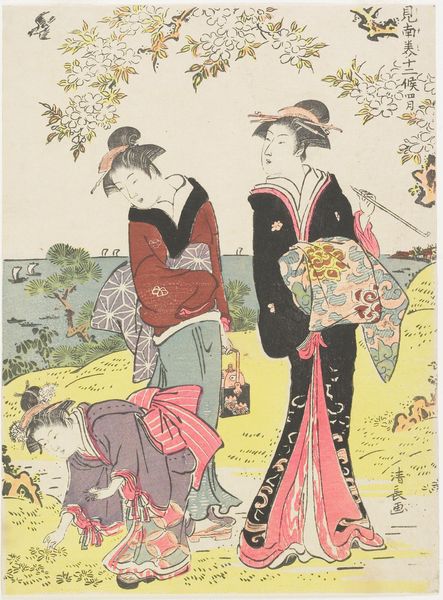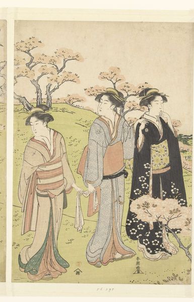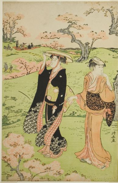 Torii Kiyonaga produced this woodblock print called ‘Cherry Blossom Viewing at Asuka Hill’. It’s an artistic expression deeply embedded in the cultural and social history of Japan. Kiyonaga created this print during the Edo period, a time marked by relative peace and economic growth in Japan, which led to the rise of a vibrant urban culture, particularly in Edo, now Tokyo. This print reflects the era's focus on leisure and entertainment, depicting a group enjoying the transient beauty of cherry blossoms, a powerful symbol of renewal and the fleeting nature of life. Cherry blossom viewing, or ‘Hanami,’ was a popular social activity, often associated with the upper classes and courtesans, like the figures in the image. As historians, we recognize that art doesn't exist in a vacuum. Its creation and reception are influenced by the social, economic, and political conditions of its time. We can use historical texts, social records, and other resources to understand the world in which Kiyonaga lived and worked, revealing the layers of meaning within this seemingly simple scene of cherry blossom viewing.