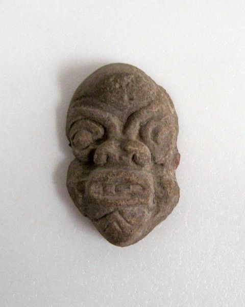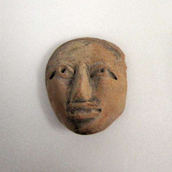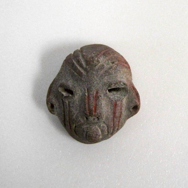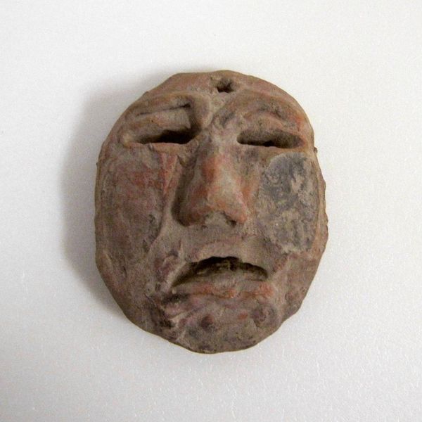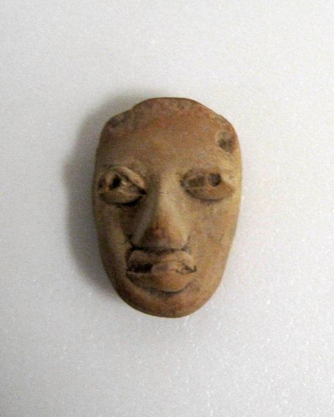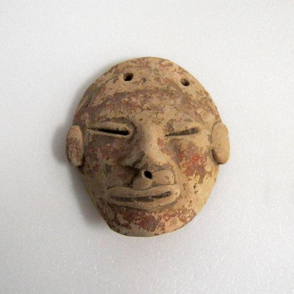 Editor: This miniature mask, created by the Tlatilco people around 1500, is crafted from ceramic earthenware. It's so small, and something about its simplicity feels very powerful. What strikes you when you look at it? Curator: Immediately, I’m drawn to the hands that shaped this earthenware. Think about the labor involved in digging the clay, processing it, and meticulously forming such a small, detailed piece. The firing process, too – what fuels were used, what social structures governed access to kilns? We need to see this mask not just as an aesthetic object, but as a product of a complex web of material resources and social relations. Editor: That's fascinating. I hadn't really considered the process so deeply. Does the size influence your view of the labor involved? Curator: Absolutely. Its miniature scale, in one sense, amplifies the labor involved, demanding a focused and controlled crafting practice. But in another, it forces us to consider its intended use. Was it meant for personal adornment, interred as part of a burial, or perhaps involved in trade or ritual practice? How does its purpose impact the material choices and the level of craftsmanship we see? Editor: It really reframes how I see the object. Thinking about the hands that shaped it, rather than just its face, really brings it to life. Curator: Precisely. It is about excavating layers of social and material history embedded within it, going beyond merely aesthetics and form. The goal is to reveal the networks of production and consumption. Editor: Thanks, I have a whole new understanding of what I am looking at now!