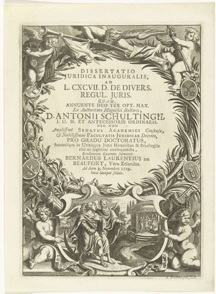Editor: So, this print is titled "Rechtvaardigheid zittend op de Hollandse leeuw" made in 1741 by Noach van der Meer the First, currently residing in the Rijksmuseum. I’m immediately struck by how this rather conventional bookplate teems with allegorical figures; it almost feels like a stage. What story do you think this image is trying to tell? Curator: Well, notice how the lion, a traditional symbol for the Dutch Republic, serves as a grounding force. Justice sits atop this lion, holding scales and a sword. Consider the implications—what does it mean when Justice, a concept already laden with symbolism, is literally and figuratively supported by national identity? What prior imagery informs the way we, and those in 1741, perceive those scales and sword? Editor: That’s a great point! It’s interesting to think about the context of its creation. Does the imagery draw from previous artwork of the era, or even earlier, perhaps ancient iconography? Curator: Absolutely. The iconography has roots reaching back to classical antiquity. The seated figure of Justice recalls images of Roman goddesses. Even the cherubic figures overhead are a clear nod to Baroque artistic conventions. Think about how the artist is intentionally invoking a specific visual language, tying contemporary ideas about Dutch sovereignty to a longer history of power and authority, even embedding christian themes in a largely secular item. What assumptions do you think they were making about their audience? Editor: That this audience, steeped in both classical and religious tradition, would immediately recognize and understand the symbolic connections being made. Almost like a visual shorthand for power. Curator: Precisely. The longevity of these symbols across vastly different cultures and eras highlights how images act as vessels of collective memory, shaping and reinforcing cultural values. Editor: This engraving makes me appreciate the power of images and symbols to shape identity! Thanks for your insights. Curator: My pleasure! Analyzing symbolic languages enriches our comprehension, both of the artwork and ourselves.