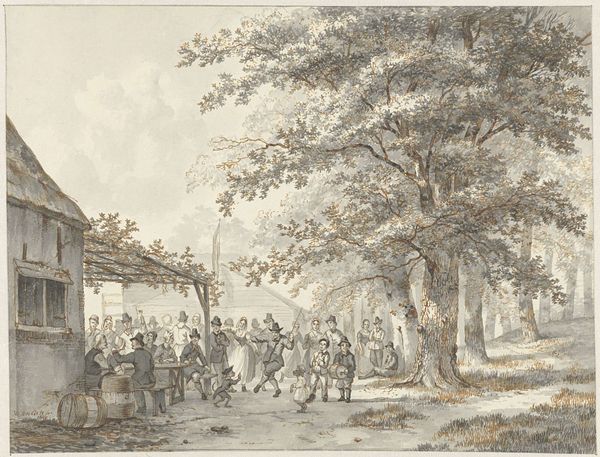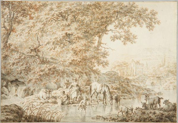 This sepia drawing by Jacob Wilhelm Mechau presents a scene of classical solemnity. Dominated by the sepia tones, the use of light and shadow creates a tranquil yet somber mood, appropriate for a burial scene. The composition invites a semiotic reading of mourning and honor through its calculated arrangement of figures and natural elements. The trees act as framing devices and the tomb, prominently placed on the left, anchors the narrative focus. Mechau uses the sepia medium to soften the harshness, creating an emotional depth that speaks to the human condition and the rituals of remembrance. The landscape becomes more than just a backdrop; it embodies the weight of history and the passing of time. Mechau masterfully employs texture and tonality, transforming a simple sepia drawing into a reflective visual experience. The careful gradation of tones and detailed rendering invite prolonged contemplation, underscoring the themes of mortality and commemoration. This sepia drawing serves as a poignant commentary on the intersection of life, death, and enduring legacy.