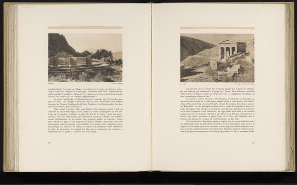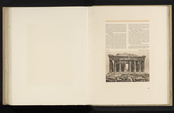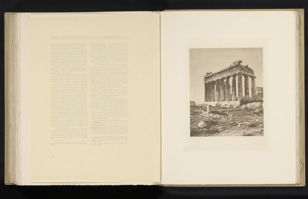 Editor: This is a print titled "Gezicht op het Parthenon" or "View of the Parthenon", created before 1910 by Frédéric Boissonnas. The print is part of a publication, and it seems to be in fairly aged condition. What do you see in this piece, especially considering its historical context? Curator: The Parthenon, a potent symbol of Athenian democracy and Western civilization, stands here framed by time and the photographic lens. Boissonnas's image, captured before 1910, exists at the intersection of art, politics, and cultural identity. Consider the Parthenon’s journey – from a temple dedicated to Athena to a church, then a mosque, and now a monument – it embodies centuries of shifting power dynamics and cultural appropriations. Editor: That's quite a journey. It seems impossible to separate it from these layers of meaning. Curator: Exactly. How does this image, reproduced within a publication, participate in the ongoing construction of Western cultural narratives? It is vital to consider who gets to tell these stories. Who has access to these spaces? And whose histories are erased in the process of myth-making? The very act of photographing and circulating this image is a political act. Editor: That makes me rethink my initial view. It's more than just a photograph; it’s a statement about cultural dominance and historical narratives. Curator: Precisely. This image invites us to question the stories we tell about ourselves and to deconstruct the power structures embedded within our understanding of history and art. Editor: I never thought I'd see one image in so many different ways. Thank you. Curator: My pleasure. Art invites a richer exploration of perspectives than we typically realize.
