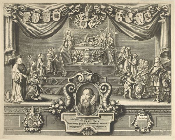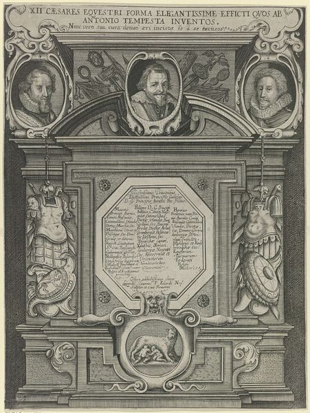Cornelis Bogerts created this print of Lutheran preachers in Amsterdam sometime in the late 18th or early 19th century. It presents us with a fascinating look at religious identity and institutional power in the Netherlands. The print depicts a pantheon of Amsterdam's Lutheran preachers within an elaborate architectural setting. This classical framework, complete with allegorical figures, elevates the status of these religious figures. The backdrop shows the cityscape of Amsterdam, grounding the preachers in a specific urban and cultural context. The inclusion of Martin Luther himself at the top suggests a direct lineage of religious authority. Prints like this served to consolidate the image of the Lutheran church but also to promote a specific theological viewpoint within a diverse religious landscape. Investigating the archives of the Lutheran church, as well as the biographies of these preachers, might tell us more about how the institution presented itself to the public. Ultimately, the print reminds us that art is always embedded in a web of social institutions.