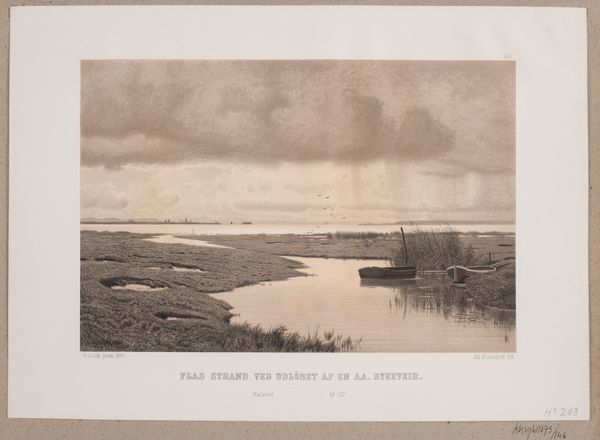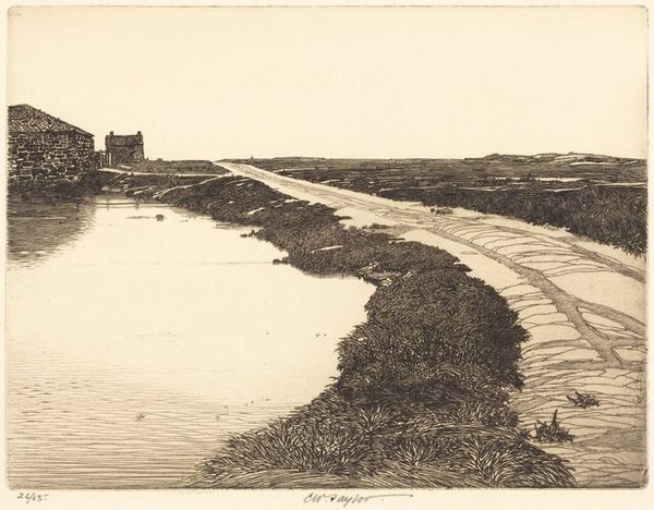 Curator: Here we have J. B. B. Wellington's "Eventide," a photogravure from 1890, currently residing here at the Minneapolis Institute of Art. It captures an English estuarine scene. Editor: It's quiet, somber even. The muted tones and soft focus create a wistful atmosphere. There's a sense of decay in the foreground with the dilapidated boat wreckage. Curator: Wellington’s pictorialist style is evident in the way he manipulates the light and shadow, creating depth and texture. Observe how the composition is structured around the winding waterway, leading the eye towards the distant structures. It's a skillful application of naturalism. Editor: Naturalism, yes, but naturalism that perhaps romanticizes rural labour. It certainly obscures the harsh realities of working-class life, reducing human figures to silhouettes on the horizon, focusing instead on horses, water and open land. What was daily work for the poor is turned into a visually pleasing scene for the emerging middle class who can buy such photographs for their homes. Curator: I can see how you read it that way. I suppose the composition isolates these figures to simple shapes but consider the way that Wellington makes subtle choices—like the repetition of white, as can be observed on the horses and the clouds, creates an effect that pulls the landscape into one picture. It evokes harmony. Editor: Harmony purchased at the expense of those not centered in it, I suspect. Did Wellington give thought to these estuarine folk or did he choose an ideal England that reflected little of reality? These gelatin prints could function as potent propaganda to justify current systems of exploitation. I don’t see any sense of interrogation of social systems, and this seems typical of the upper-class English sensibility. Curator: Even if his intent was purely aesthetic, which I suspect it was, it doesn't negate the visual interest. I think his subtle, masterful manipulation of tone contributes to the impact of this image. Editor: And I suggest we can’t afford to divorce images like these from the social contexts from which they are born. We mustn’t divorce images from ideology. Curator: An important consideration, indeed. Editor: Always is, always will be.