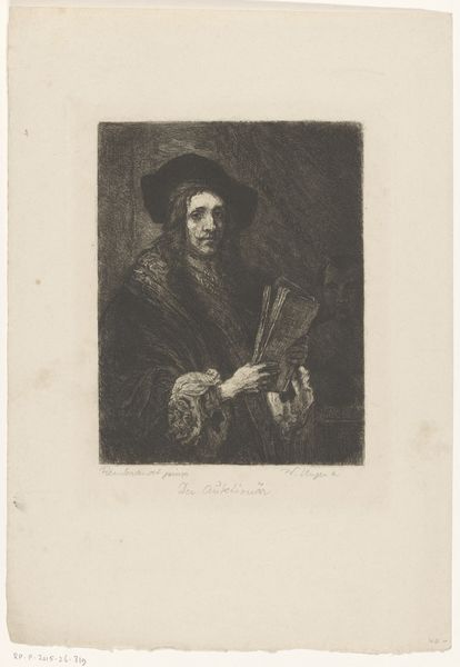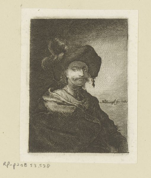 This self-portrait of Rembrandt van Rijn was made by Georg Friedrich Schmidt, probably in the mid-1700s, using etching and engraving techniques. The image is created by drawing into a metal plate with a sharp needle, then applying acid to bite the lines. The plate is then inked and printed, transferring the image onto paper. Note that this is a reproductive print, intended to circulate widely. Schmidt was a highly skilled printmaker. It would have taken time and effort to mimic the style and qualities of an artist like Rembrandt, known for his painterly style and use of light and shadow. It's important to consider the social context of printmaking at this time. Prints were a way to democratize art, making it accessible to a wider audience. However, the labor involved in creating these prints was often invisible. By focusing on the materials and processes used to create this image, we can better understand its cultural significance and challenge traditional distinctions between fine art and craft.