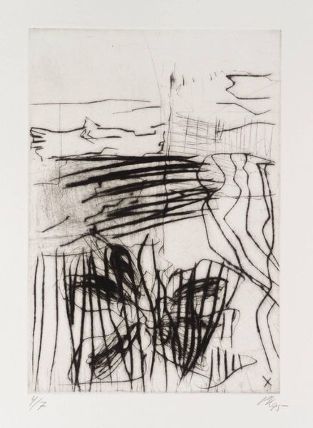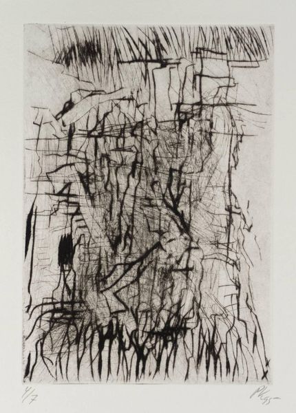 Curator: This untitled etching by Per Kirkeby, made in 1995, presents a fascinating web of lines. It is part of the Tate collection, and the image itself measures about 198 by 136 millimeters. Editor: My first impression is… chaos! But a controlled chaos. There is something primal about the marks, like the feeling of being lost in a dense forest. Curator: Kirkeby, trained as a geologist, often brought that sensibility into his art. He wasn't interested in representing nature realistically, but rather in capturing its energy and structure. Editor: Yes! I see that now. It feels like a deconstruction of landscape, an almost violent excavation of forms and textures. How do you think its cultural context plays into this piece? Curator: Well, Kirkeby came of age in post-war Denmark. His generation wrestled with questions of national identity and the role of art in a rapidly changing world. Abstraction, like this etching, became a way to explore universal themes beyond specific political narratives. Editor: I think you’re right. It almost feels like the lines are trying to escape the frame, pushing against the boundaries of the paper. I find it very powerful, and a surprisingly emotional print. Curator: I agree. There’s a raw honesty to his mark-making that transcends its historical context. Editor: Absolutely. It is a powerful reminder of art’s capacity to evoke emotions in a tangible way.