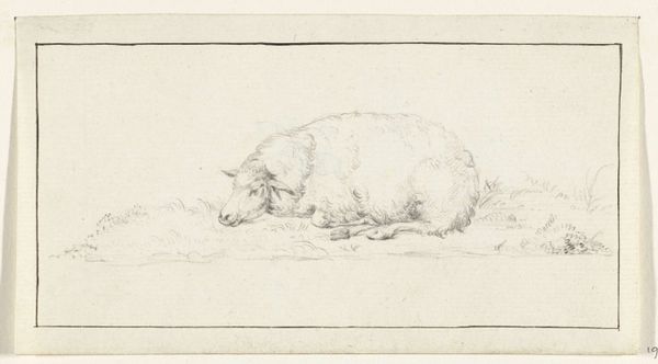 Editor: Here we have Hendrik Voogd’s pencil drawing, “Drinkende koe, tot de knieën in het water staand,” placing a drinking cow knee-deep in water, sometime between 1788 and 1839. It feels very much like a simple observation, but something about its starkness feels profound. What do you make of it? Curator: There’s a peculiar serenity, isn’t there? The image is incredibly spare, nearly monochromatic. The cow, half-submerged, is almost a baptismal image; what’s being washed away and what’s being renewed? Remember that animals often represent instincts, nature's power. What instincts do you think are engaged here? Editor: Well, certainly thirst! But maybe it’s about the most fundamental connection to nature. A sort of visual meditation on survival and belonging? Curator: Precisely. This work highlights how essential, commonplace acts like drinking resonate far beyond the literal. There’s a dialogue between the mundane act and its symbolic weight, heightened by the almost spiritual quietness. Does it evoke specific memories or feelings in you? Editor: It reminds me of summers spent by the river as a kid – that sense of total immersion in the natural world. So it's interesting how a simple drawing of a cow can trigger such a visceral memory and a sense of place. Curator: It's the power of iconography – taking everyday images and imbuing them with layers of cultural and personal meaning. What we see isn't just a cow drinking but an enduring symbol of connection. Editor: I never thought a cow could hold so much depth. I appreciate how it prompts a wider meditation on simplicity, nature, and memory. Curator: Indeed, sometimes the quietest images resonate the loudest.