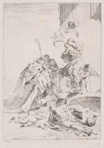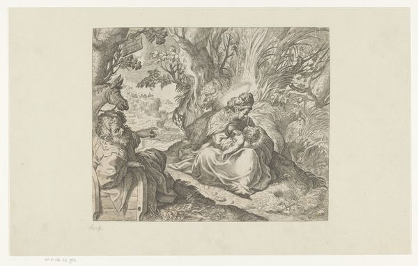 This is Gerrit Pietersz’s etching, 'The Rest on the Flight into Egypt,' made around 1597. It depicts Mary, Joseph, and the infant Jesus pausing during their escape to Egypt, a story resonant with themes of refuge and survival. Pietersz situates the Holy Family within the natural world, a place of respite but also a reminder of their vulnerability as migrants. Mary is shown tending to her child, a universal image of maternal care, yet layered with the specific anxieties of a mother fleeing persecution. Joseph, often marginalized in depictions of the Holy Family, here appears watchful, embodying the protective role he undertook. Consider how the image resonates with contemporary experiences of displacement, and the intersectional layers of religion, gender, and class that shape refugee experiences. The work invites us to reflect on the intimate and personal dimensions of larger historical events.
