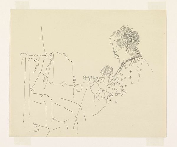Curator: Ceri Richards' "Bagatelle" presents us with an intimate scene of a woman playing the piano, rendered in a limited palette. Editor: It’s immediately striking how the brown hues create a sense of warmth, almost domesticity, yet the composition feels rather fragmented. Curator: Richards’ treatment of form is quite fascinating. He focuses on planes of color and bold outlines, minimizing detail to amplify the structural elements. The musical score behind the pianist also seems integral to the scene. Editor: Absolutely. One can't ignore how the image references the tradition of women, pianos, and domestic life, particularly the commodification of leisure time. Curator: I'm more concerned with how the repetition of linear forms—in the keyboard, the score, and even the woman's body—creates a rhythmic complexity. Editor: I see that, though it also speaks to how social expectations constrain identity within confined spaces. Curator: Ultimately, it’s the dialogue between form and feeling that elevates this piece. Editor: Indeed, and how it reflects broader cultural narratives about women, music, and their place in society.