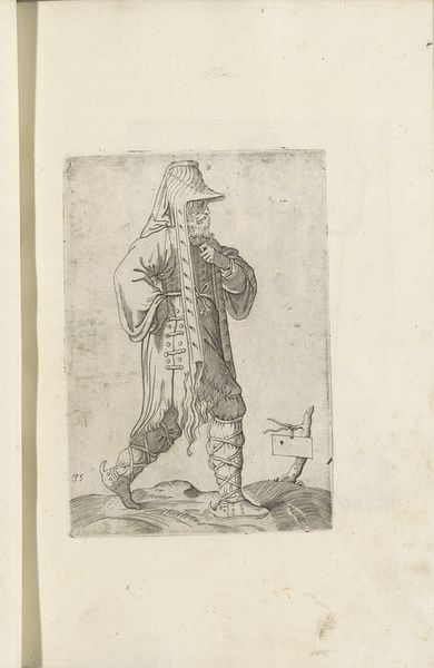 Curator: This fascinating pencil drawing, "Duitse Soldaat," created in 1569, can be found in the Rijksmuseum. It’s attributed to Ferando Bertelli. Editor: It has a sort of quirky charm, doesn't it? Almost like a doodle, a quick observation jotted down in a sketchbook. But there’s also an intensity to the detail in his outfit. Curator: Absolutely. The northern Renaissance was marked by meticulous detail, yet here the materials—pencil on toned paper—hint at a process rooted in preliminary sketchwork. It wasn't intended as a standalone work, rather a study perhaps related to military manufacturing in this era. Editor: Yes! Like a preparatory drawing. Imagine him sketching furiously in the margins of something, or while waiting on set for a painting commission, his charcoal catching the essence of the textures, the weight of his arms holding the rifle, the feathered cap—almost like the flourish of a signature. Curator: Consider the historical context. This drawing appears in a period rife with militarization and changing notions of the very structure of early-modern armies, from how their uniform looked to the labour division within those troops. Bertelli isn't just drawing a soldier. It's an attempt at a realistic capture of what those social dynamics are in reality. Editor: The weight of history on him; almost too heavy. Perhaps he did understand the implication of what he was drawing back then, the sense of duty of soldiers towards something... that at that stage would still have been so much like the idea of nothingness, no state nor homeland yet. I feel strangely sentimental and detached by him carrying everything, walking steadily, in spite of it all. Curator: It does make you reflect on the material realities and even labor that supported these individuals who appear prominently in paintings, shifting our gaze towards previously obscured narratives of production and consumption around soldier's garments and goods in the early-modern Europe. Editor: I think I understand better, the weight carried in him. And what before just felt like the flair of feathery decoration turns almost unbearable now: to have all the vanity loaded, just by belonging in someone else's dream... a nation-state he wouldn't even see in full bloom. A society where only those capable to consume and materialise these goods can even paint them at such scale! Curator: Seeing Bertelli’s "Duitse Soldaat" has made me consider the unacknowledged labour behind historical displays of military power even further than usual, and question traditional art historical narratives even further Editor: Agreed. This little sketch has brought a certain clarity through the lens of history and individual pathos. It goes to show what treasures are hidden among even what appear like simple notes from our most human makers.
