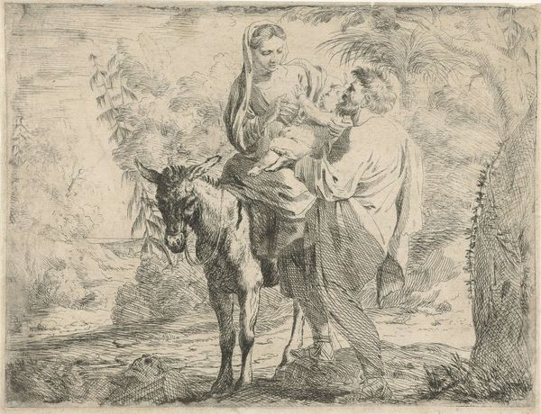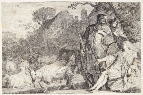 Moyses van Wtenbrouck etched this pastoral scene, presenting a shepherdess amidst her flock, a timeless image of harmony between humans and nature. The shepherdess herself, draped in classical garb, leans against a thick tree, her posture echoing figures of nymphs and goddesses from antiquity. This intentional allusion connects her to a lineage of idealized femininity, evoking a sense of timeless beauty and serenity. Consider, for instance, how similar figures appear in Renaissance paintings, drawing inspiration from classical sculptures, each reiteration imbuing the figure with new cultural meanings. The presence of the animals, calmly grazing and drinking, reinforces this pastoral ideal. The scene resonates with a longing for a simpler, more natural existence, a theme that has echoed through art and literature for centuries. This yearning taps into our collective memory, a shared human desire for peace and tranquility found in the natural world.