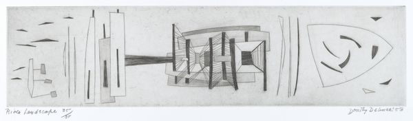 Editor: This untitled etching by Dieter Roth presents a fascinating combination of geometric forms and photographic images. There's a curious tension between the ordered lines and the chaotic textures in the lower left. What's your perspective on this work? Curator: Roth often challenged traditional art boundaries. The incorporation of photographic elements here highlights the changing role of imagery in art and culture, questioning the distinction between representation and reality. Is he perhaps reflecting on the proliferation of images in postwar society? Editor: That's a thought-provoking point. The grid-like structure almost feels like a screen, and the photographs are trying to break free. Curator: Exactly! And consider the limited edition number. It hints at a democratization of art, yet retains an element of exclusivity. How do you see that tension playing out? Editor: I hadn't considered that aspect. It's like Roth is simultaneously embracing and critiquing the art market. Curator: Precisely. Roth's work invites us to question the very systems that define art. Editor: This really changed how I see the piece, thanks. Curator: It's all about understanding the cultural conversation!